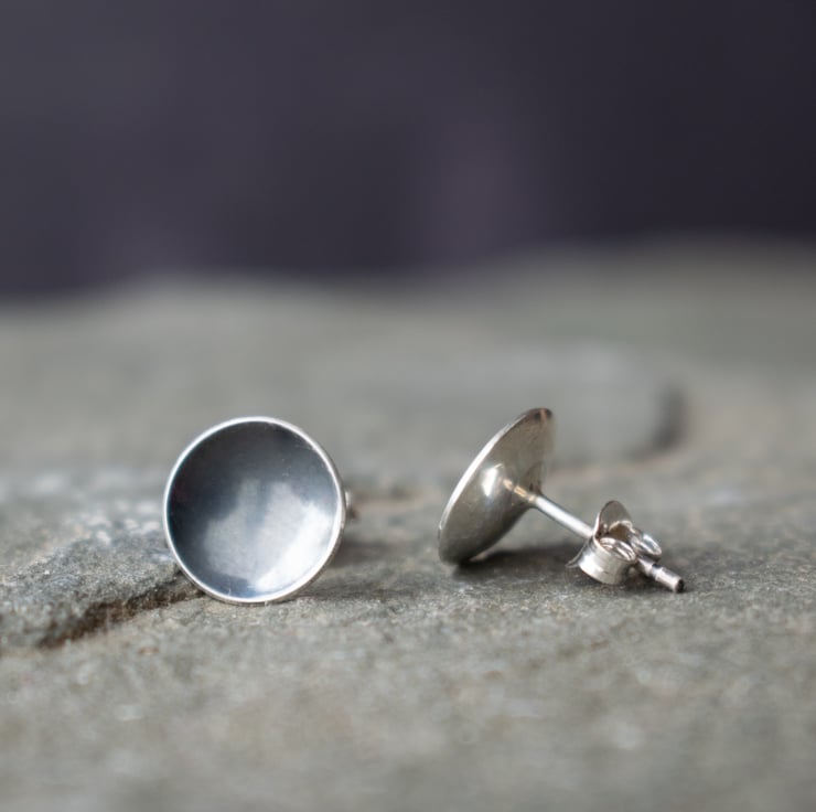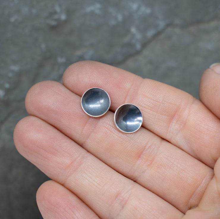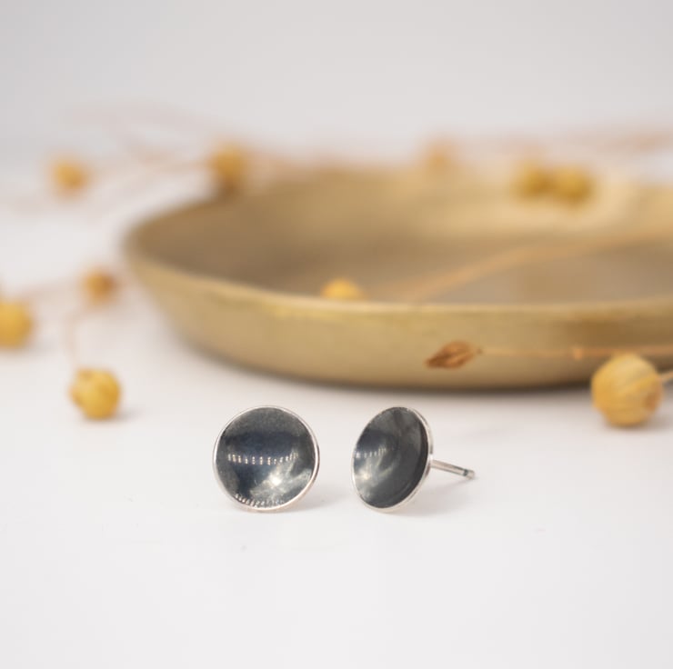 These stylish circular silver dome studs are perfect for everyday wear and make for a versatile addition to your contemporary wardrobe. They have been oxidised to darken the silver before polishing the edges and reverse of the dome to a high shine to really make the design stand out. They are a lovely gift for fans of modern, artisan jewellery.