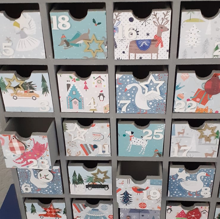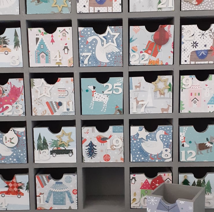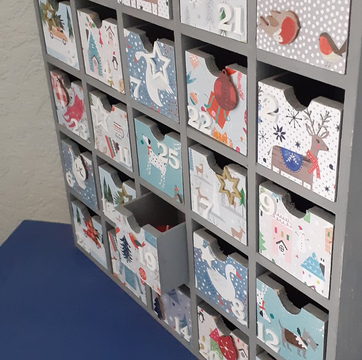 Wooden advent calendar painted in Rustoleum Flint. It has 25 drawers all of which have white wooden numbers and some are decorated with wooden christmas themed embellishments.