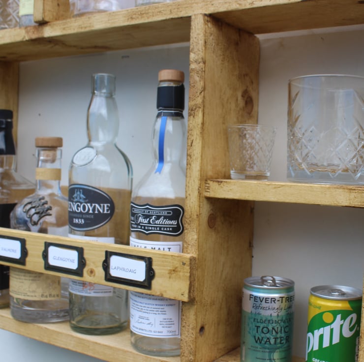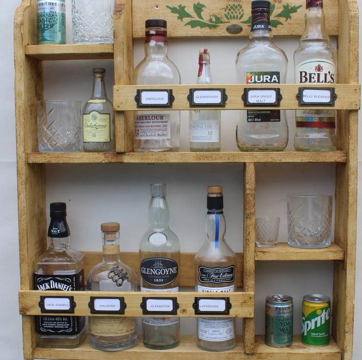 Hand made with bottles & glass's etc. on 2 different levels. I have also painted a Scottish thistle motif on the back of the rack.