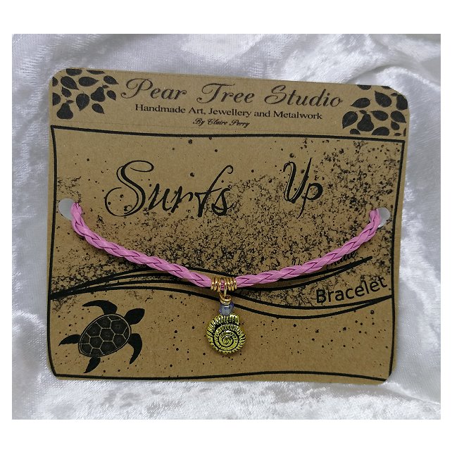 Bracelet light pink Faux Leather Strap with a gold plated clasp and gold plated Seashell charm bead.
