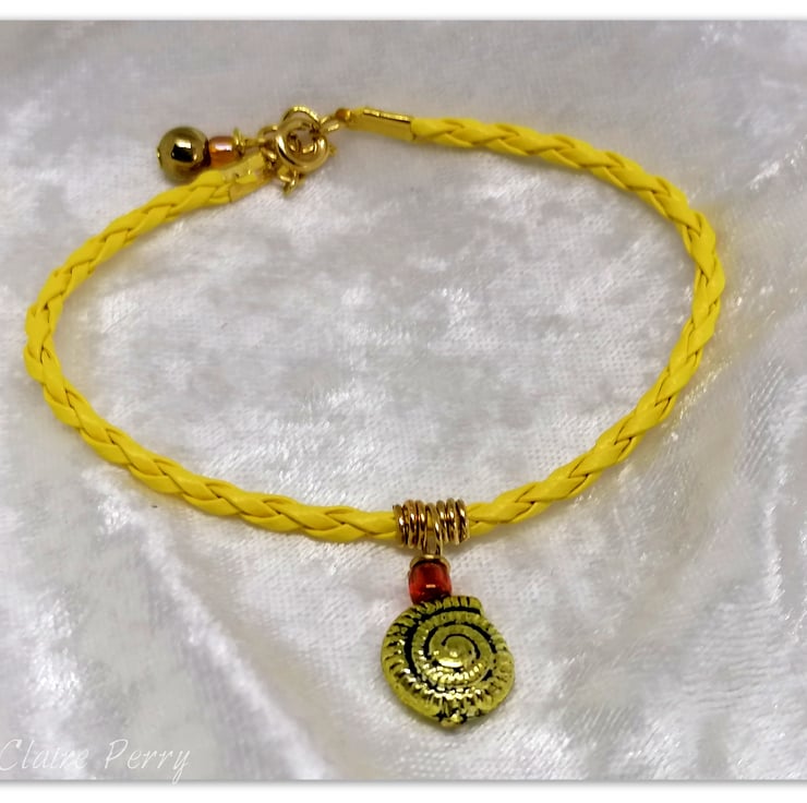 Bracelet Yellow Faux Leather Strap with a gold plated clasp and gold plated Seashell charm bead.