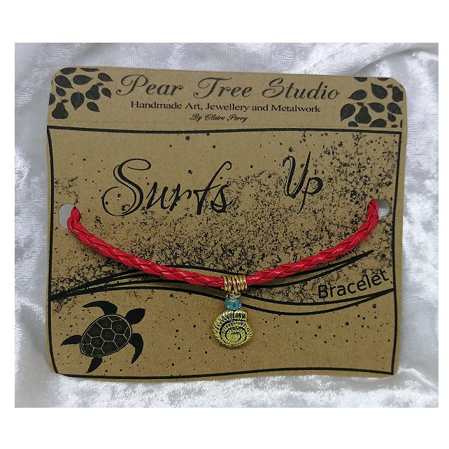 Bracelet Red Faux Leather Strap with a gold plated clasp and gold plated Shell charm bead.