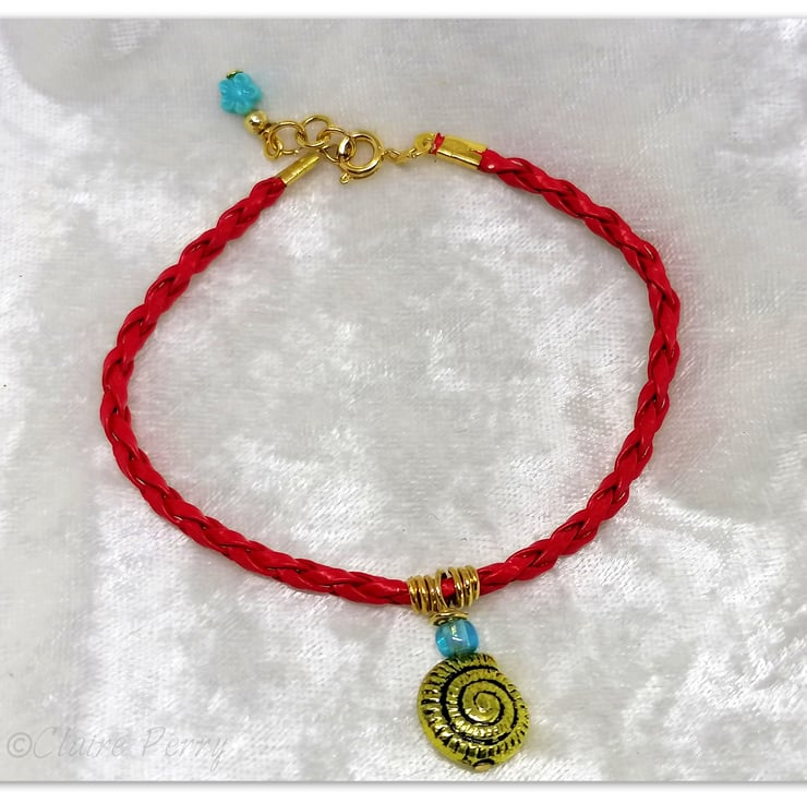 Bracelet Red Faux Leather with gold plated Shell charm bead.