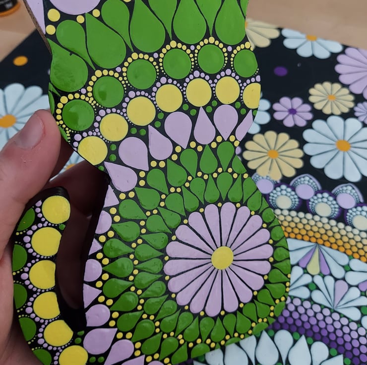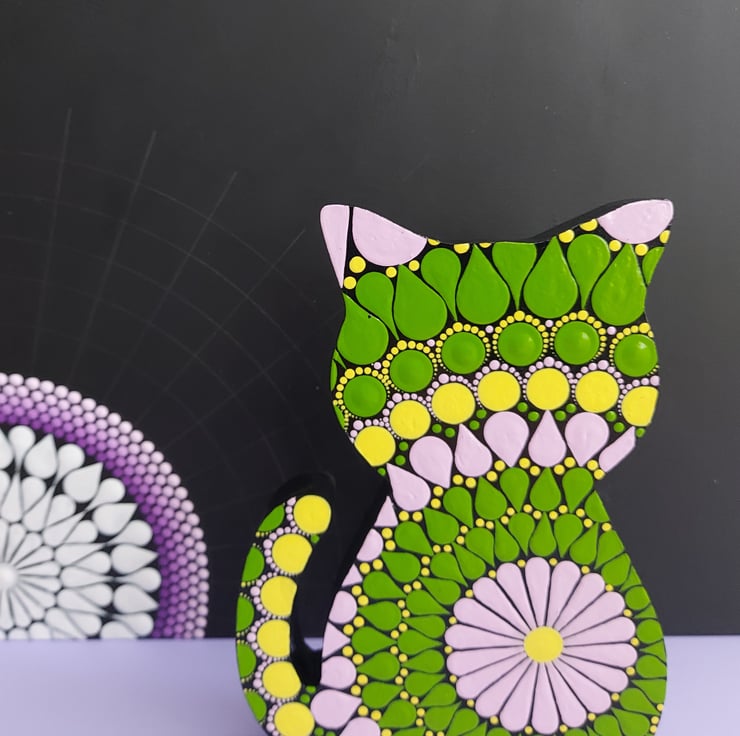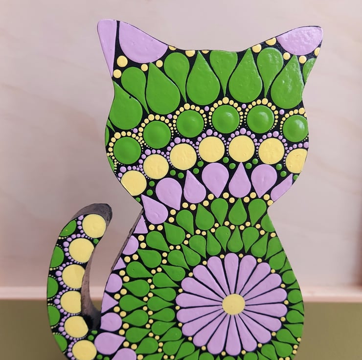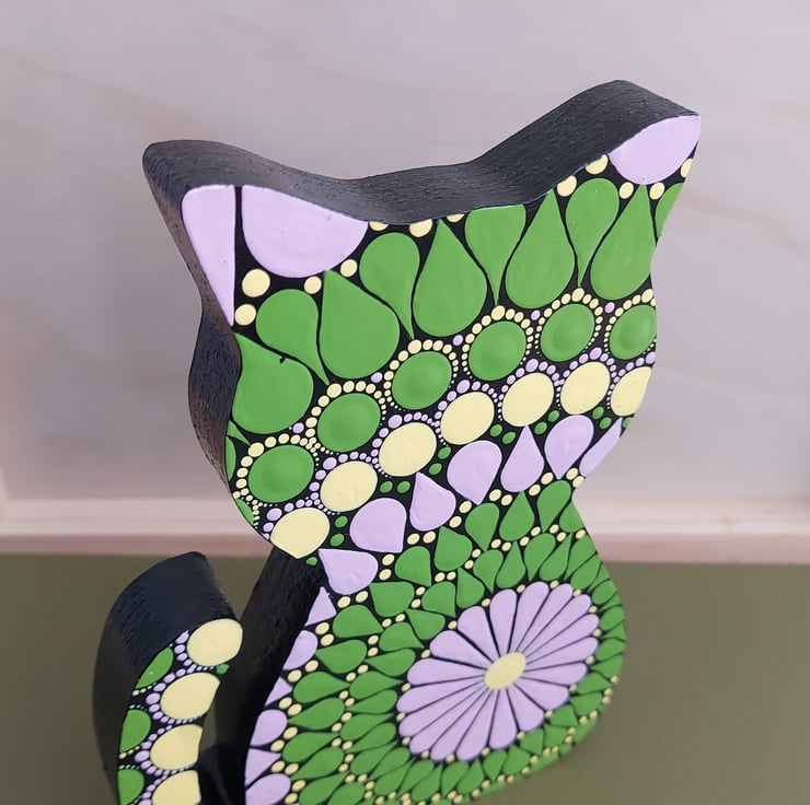 The cat is hand painted with a green, soft pink and yellow mandala design. The outer edge and back of the cat are black.