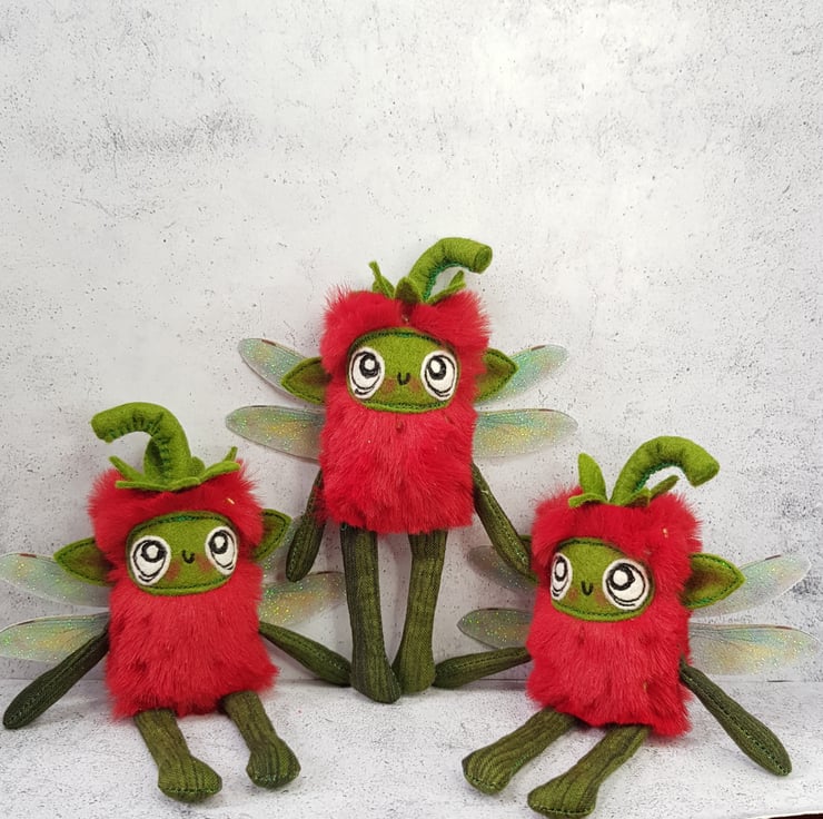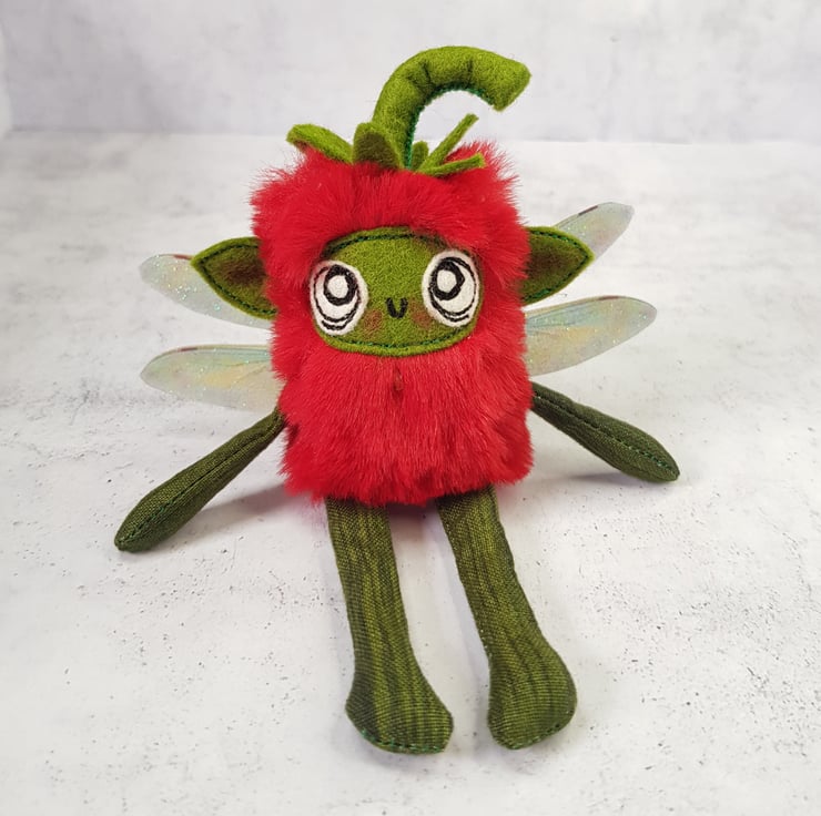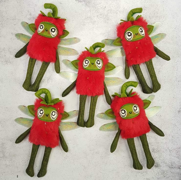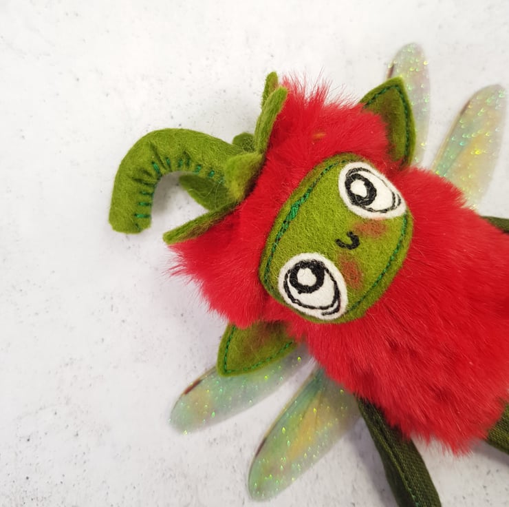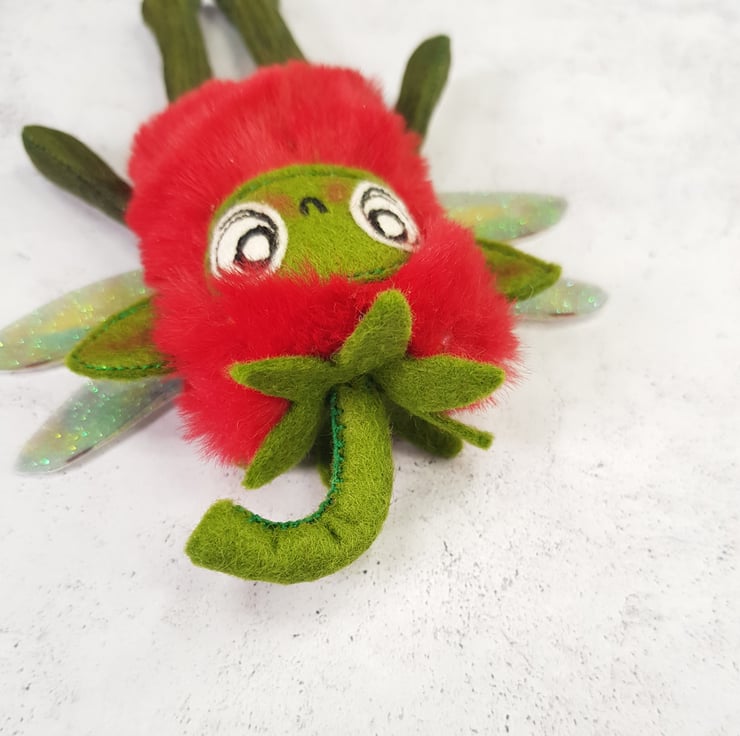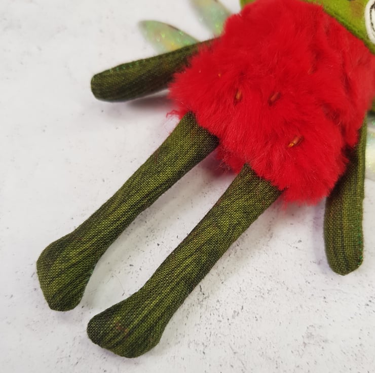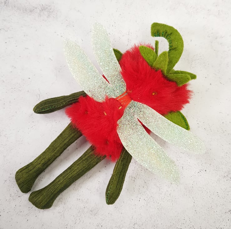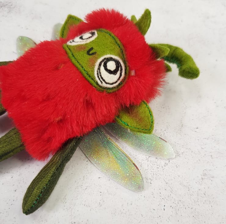Made with soft red plush, this cute fairy has a free motion embroidered felt face with hand stitched felt stem. Arms and legs are cotton and the green pips are beads hand stitched all over the body. Fairy has printed sparkly glitter wings. Fairy measures roughly 13cm tall with an 8cm wingspan and comes with a clear thread hanger. This listing is for one fairy only.