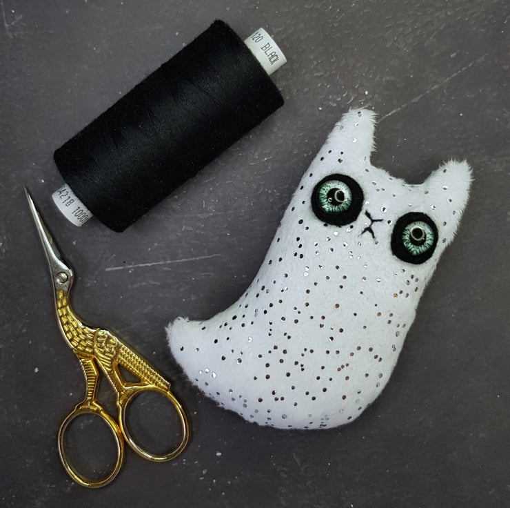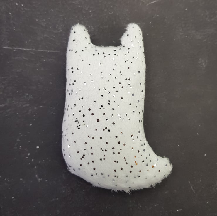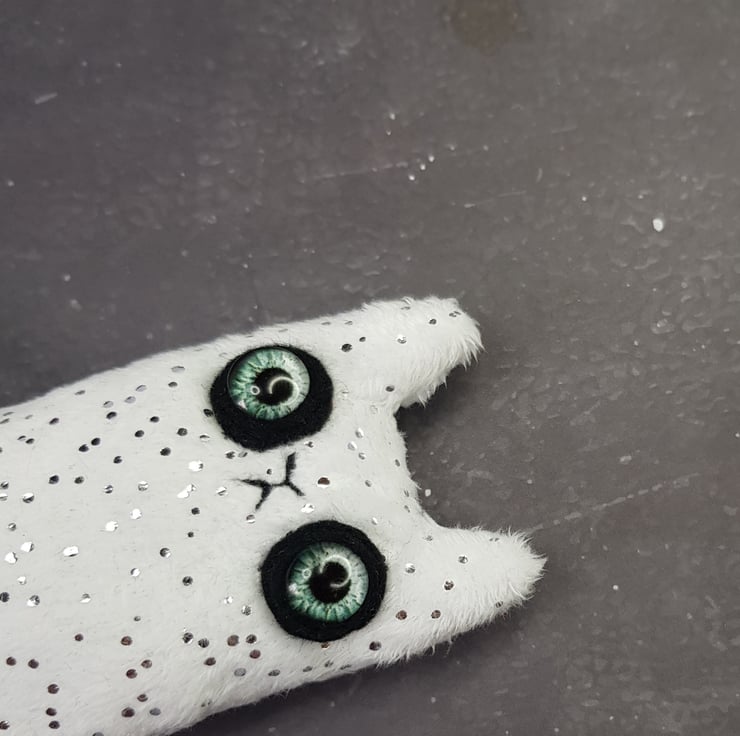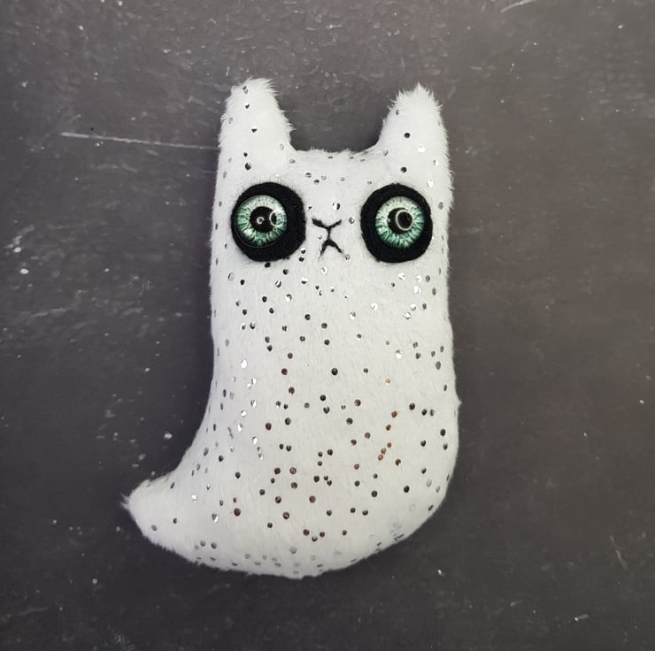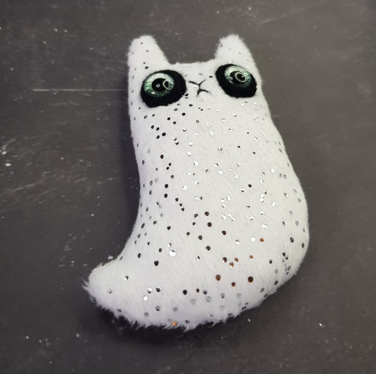 Soft kitty made with metallic sparkle plush fabric. This ghost has glass eyes with with a hand sewn felt surround. Cat comes with transparent thread hanger and measures roughly 10cm tall.