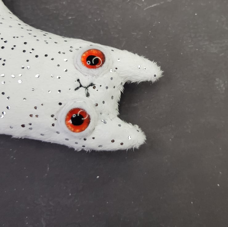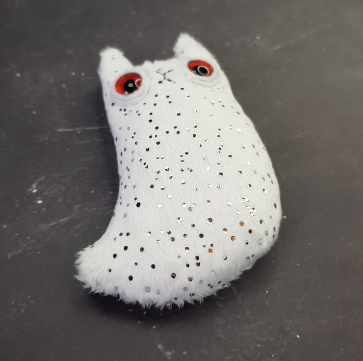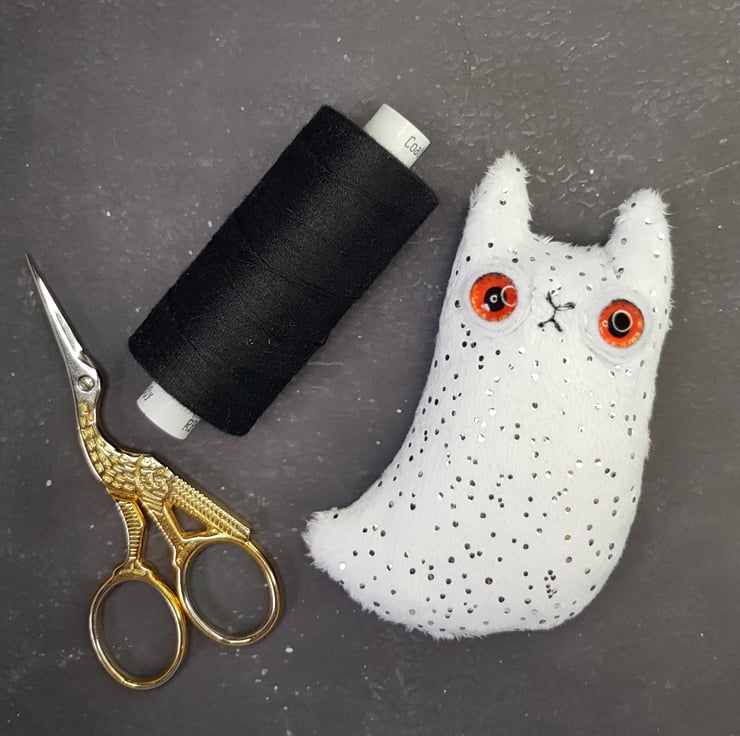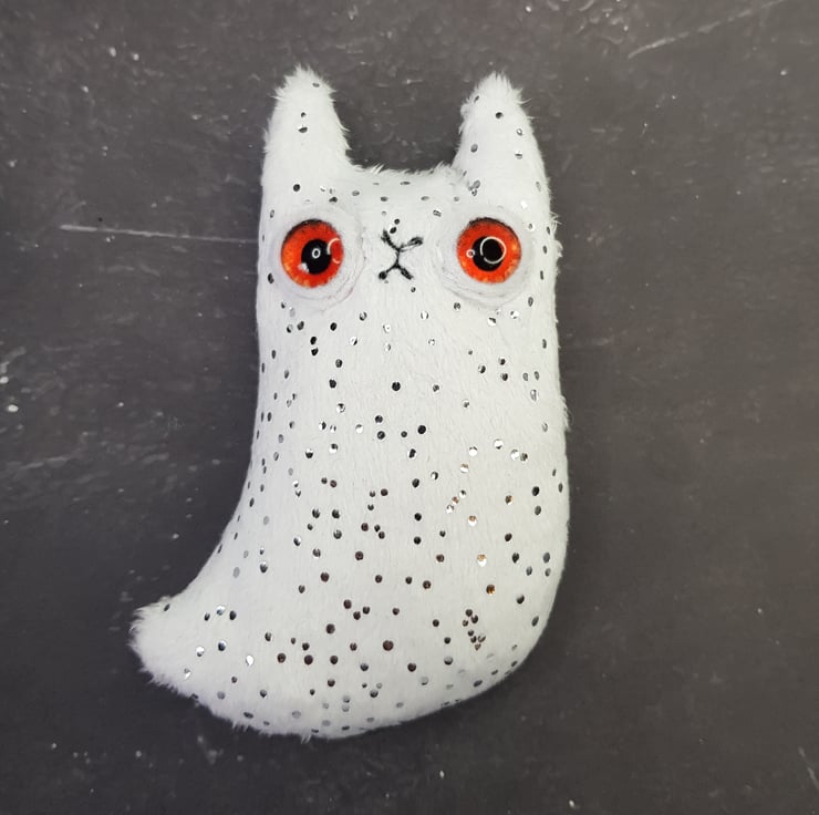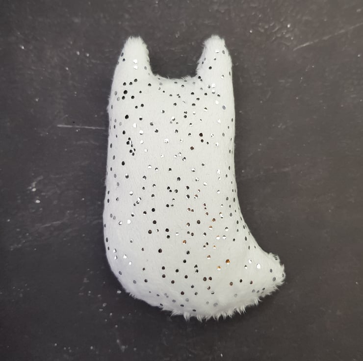Soft kitty made with metallic sparkle plush fabric. This ghost has glass eyes with with a hand sewn felt surround. Cat comes with transparent thread hanger and measures roughly 10cm tall.