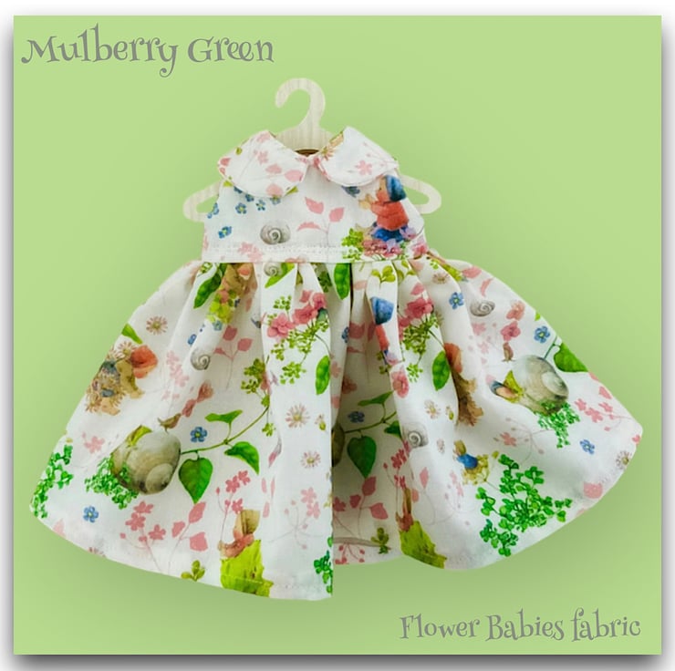 A really sweet little dress in a flower babies design, to fit the Mulberry Green characters. The dress is made from best quality cotton and has a full skirt and a lined bodice.