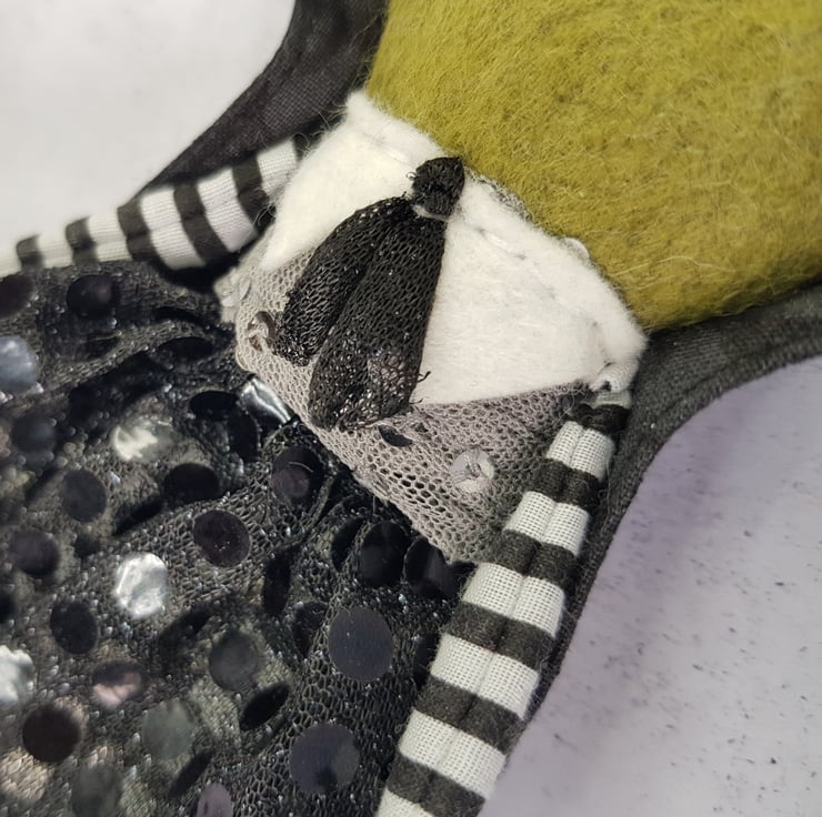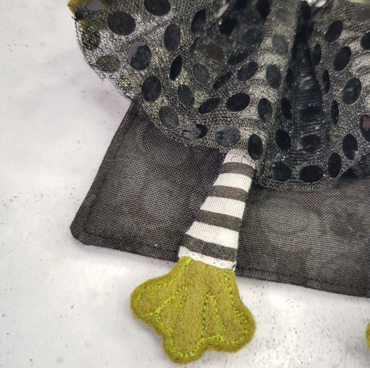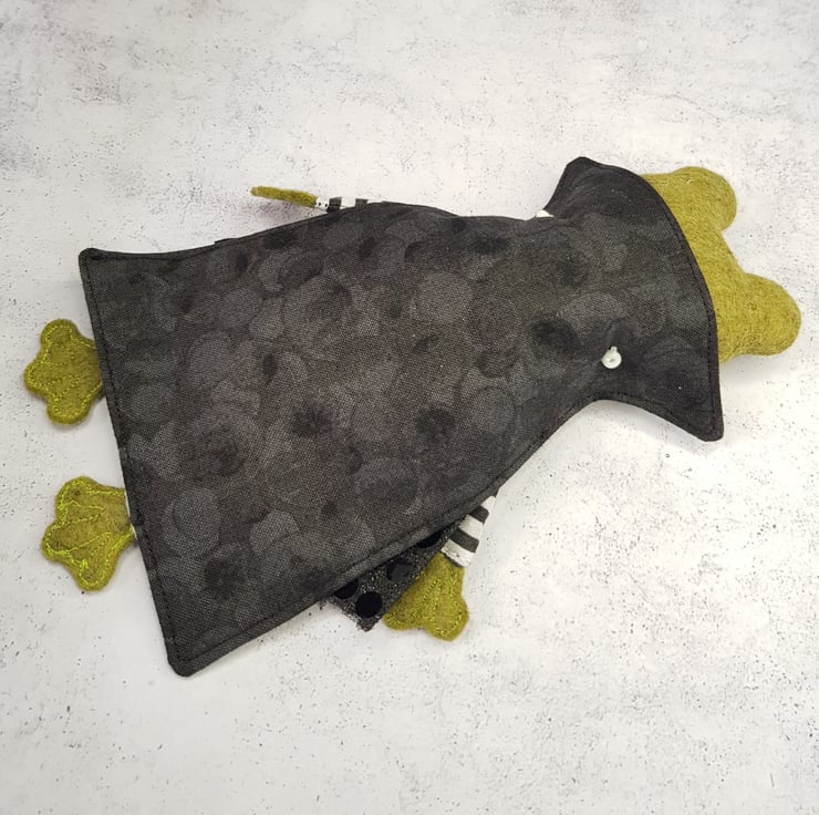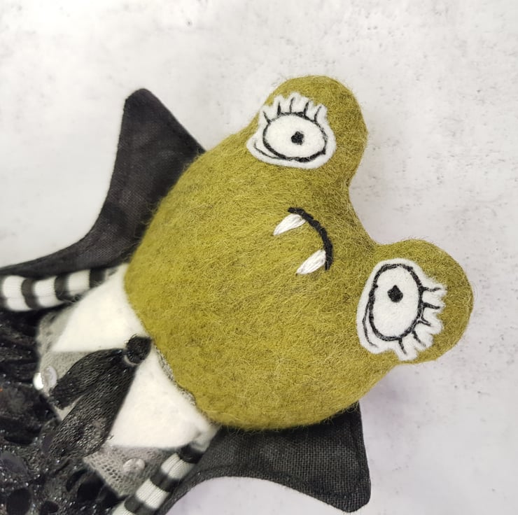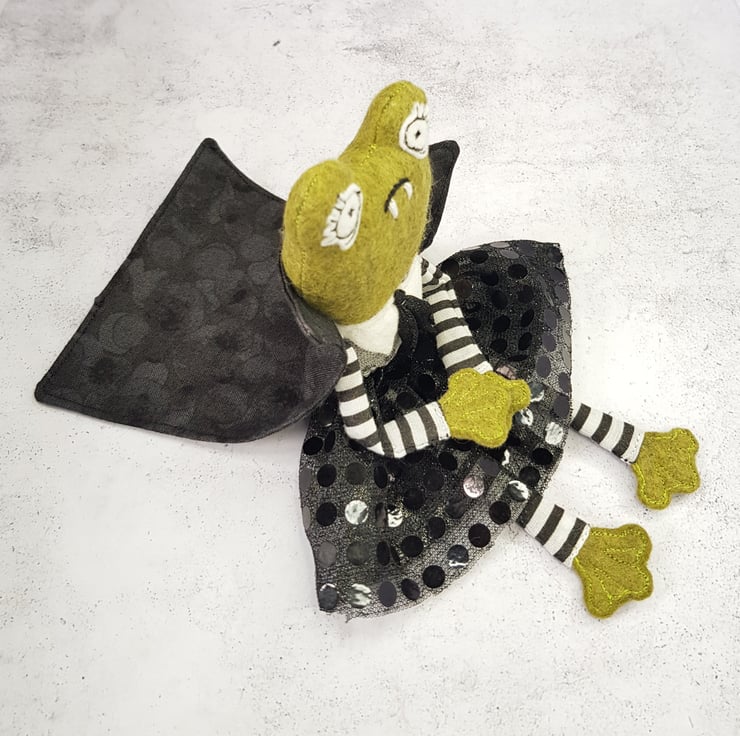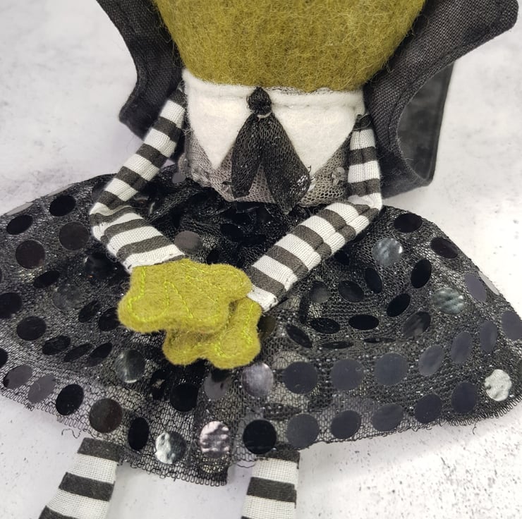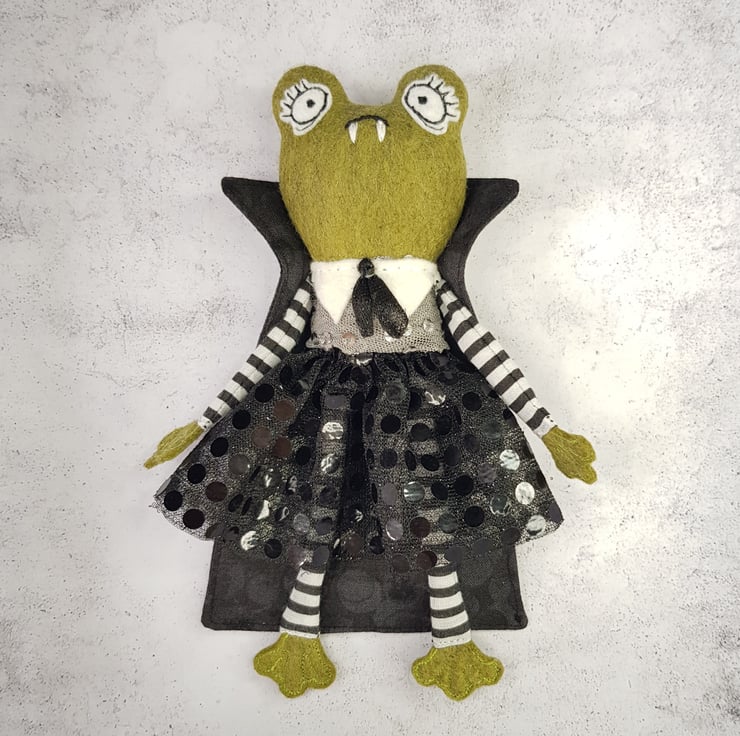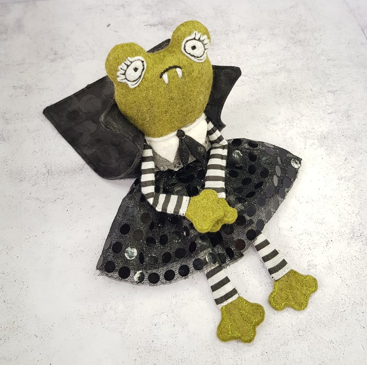 This little vamp has a felt body with free motion embroidered felt eyes, hands and feet. They wear a mix of new and upcycled materials with their clothes sewn into place. This one of a kind art doll wears a Cape with high collar. Doll measures roughly 18cm tall and is not a toy, this is meant for decorative purposes only.