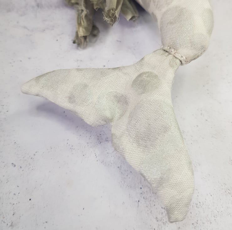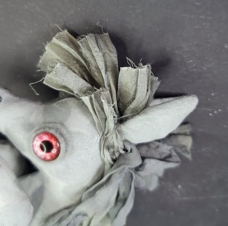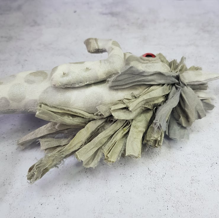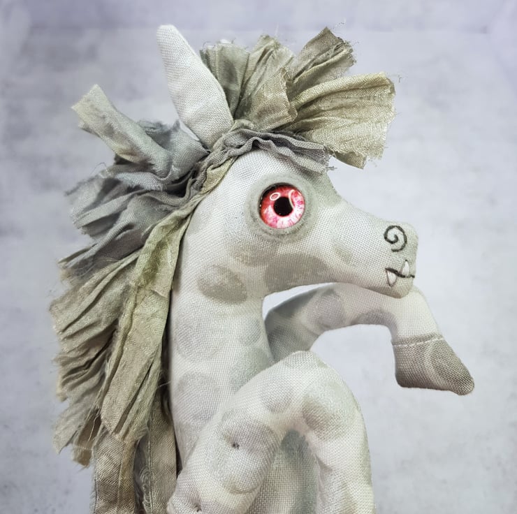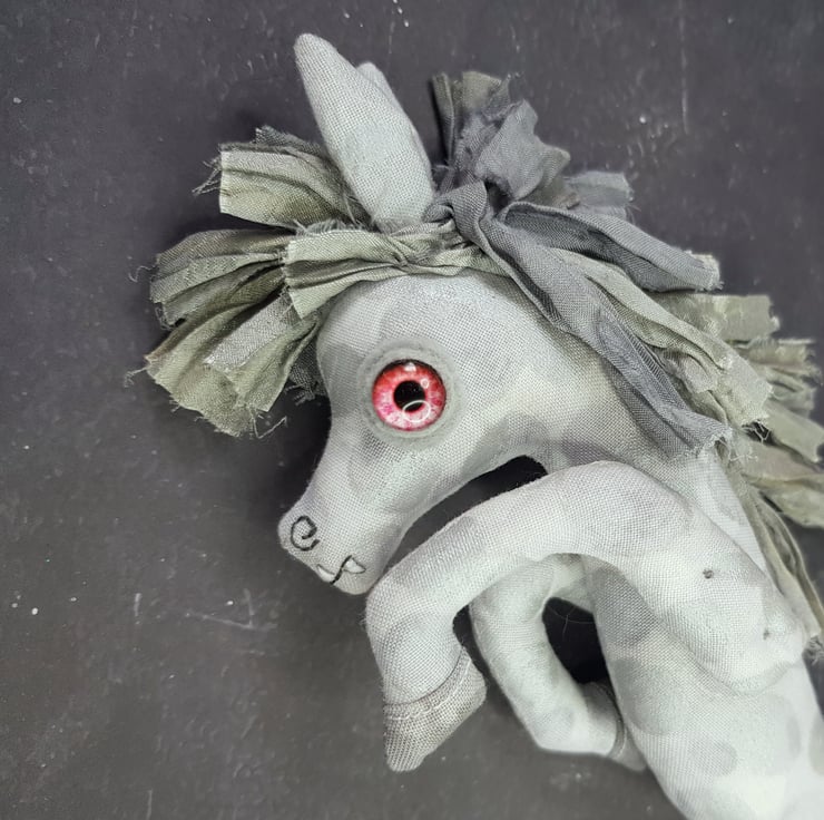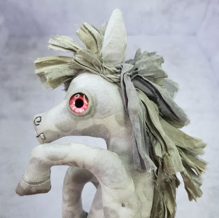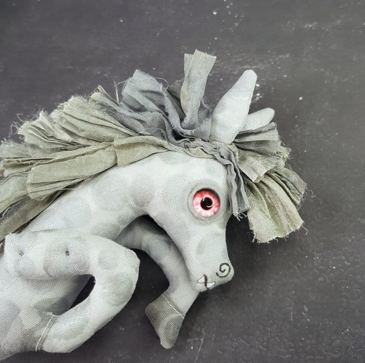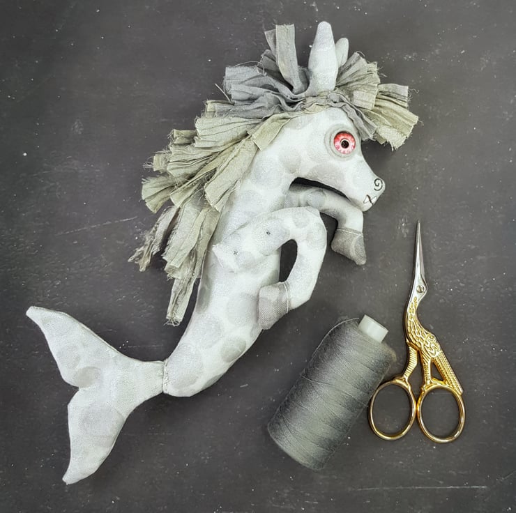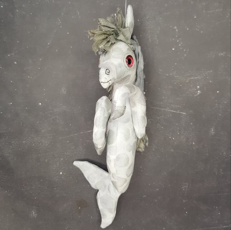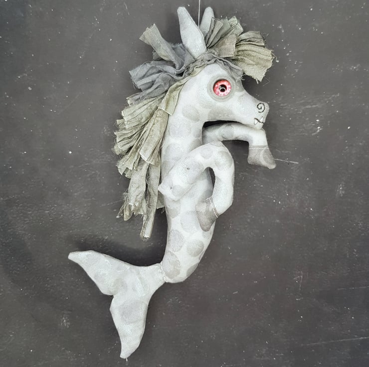 This one of a kind creepy cryptid is made from a multi tonal cotton with sari silk maine hand sewn into place. The eyes are glass with hand stitched felt surround. The kelpie has cute little hand embroidered fangs and nostrils. Kelpie measures roughly 21cm tall and is meant for decorative purposes only.
