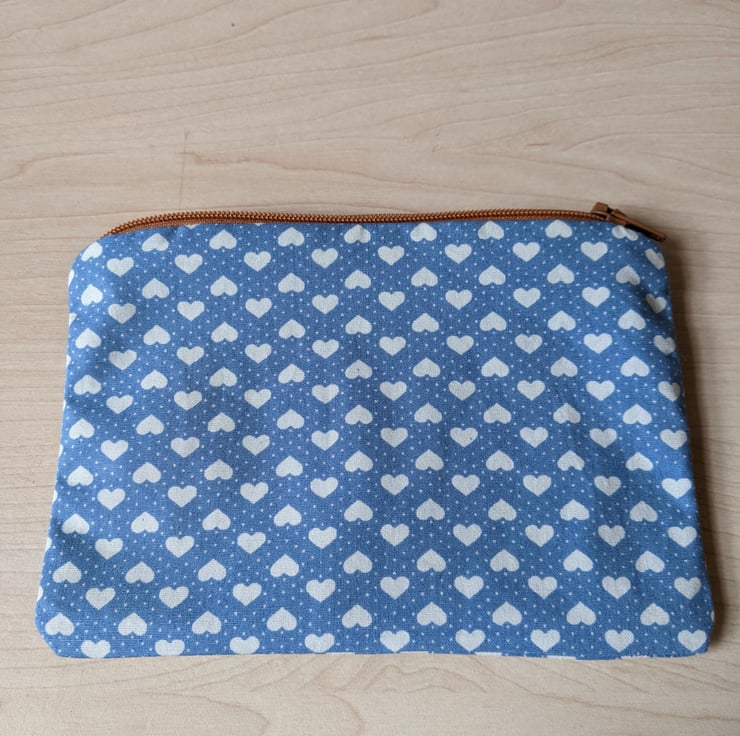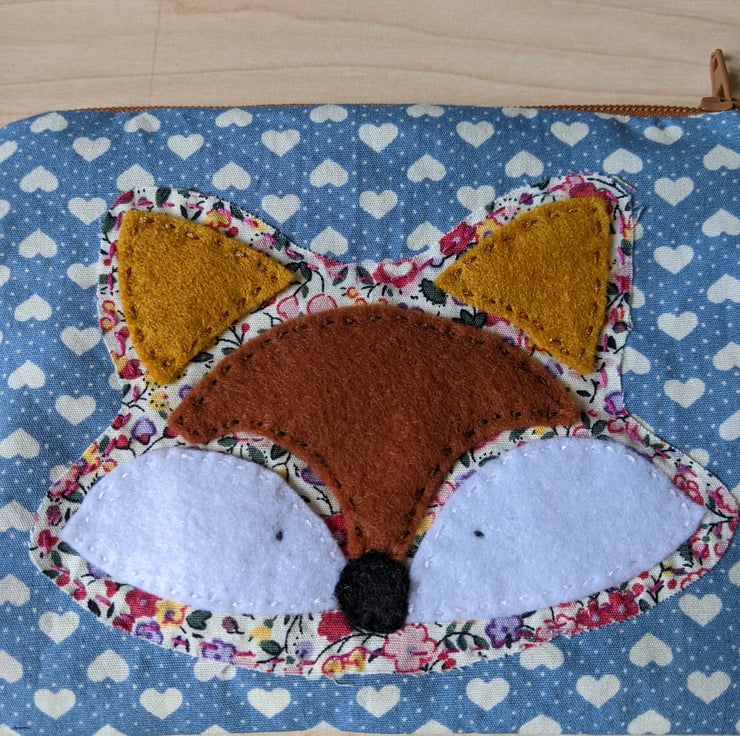 Fully-lined, handmade and hand-appliquéd fox coin purse with light brown zip and purple lining. The main fabric is a duck egg blue 100% cotton with cream hearts and polka dots The appliqué fox is backed with a ditsy floral cotton with brown,white and black felt overlays hand stitched in place.