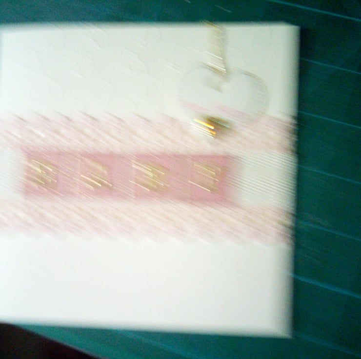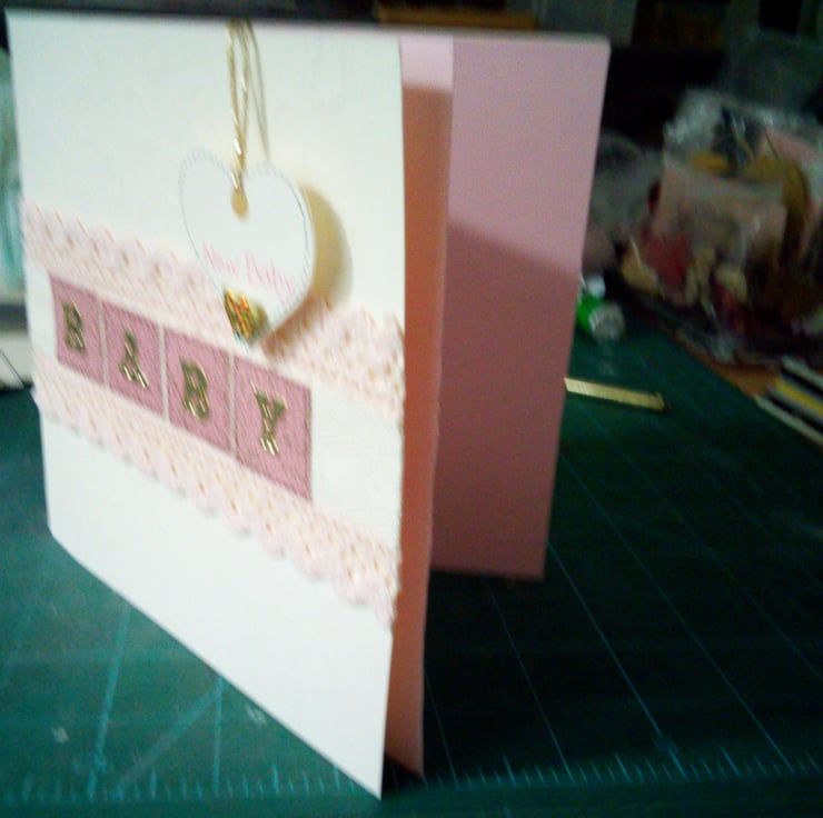 A completely handmade and uniquely designed card. Consisting of baby mounted onto pink/ gold squares. Then onto cream ribbon then onto baby feet embossed quality cream card. A heart tag dangles from gold cord with new baby and gold heart? Finished off with pink cotton lace