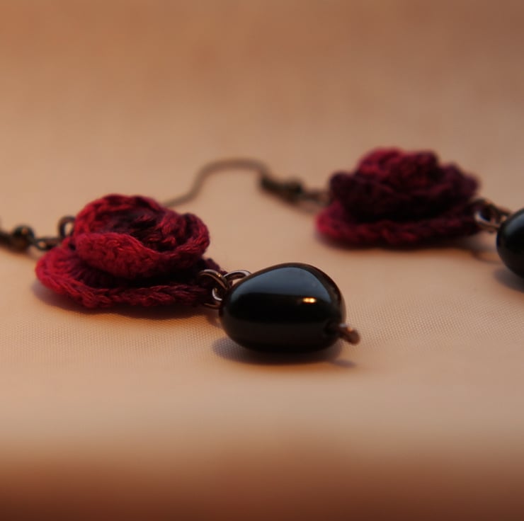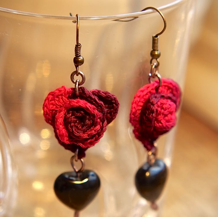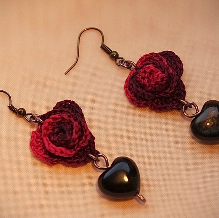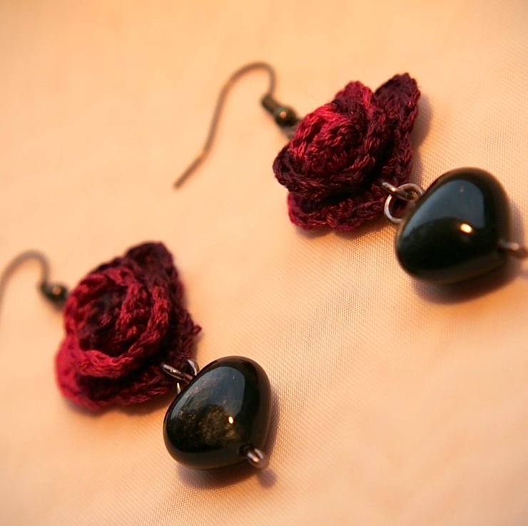 Gothic Crochet Heart Roses Earrings made with Heart Shape Obsidians and Embroidery Threads.