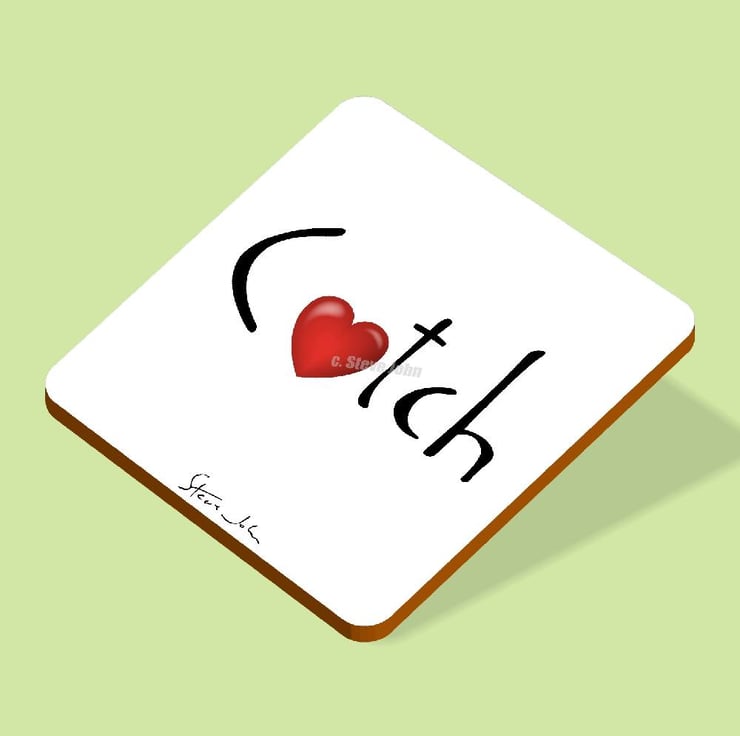 Cwtch word with the 'w' replaced with a heart. Sublimation printed coaster, 9cm square with round corners. High gloss finish.