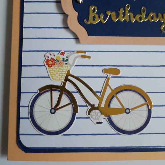 I have added die cut flowers and flourishes around the topper and a die cut bicycle with a flower filled basket to the bottom left corner of the card front, there is a gold die cut bee and gems in the flower centres.