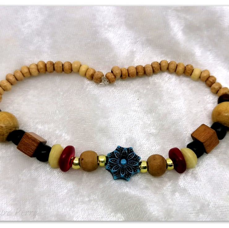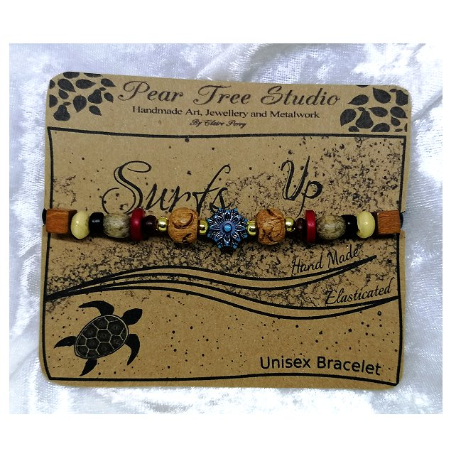 Elasticated Surf bracelet with wooden beads and Turquoise/ gold acrylic beads.