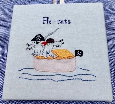 are sailing off to the Spanish main in a pie in search of treasure & fun! The rats have been hand embroidered onto pale blue linen. The "pie boat" has been painted with acrylic paint. The picture has then been mounted onto mount board & backed with natural linen. There is a small piece of cream ribbon to hang up the picture with. The picture measures 18cm x 18 cm. This would make a fun gift.