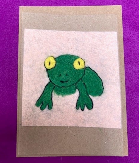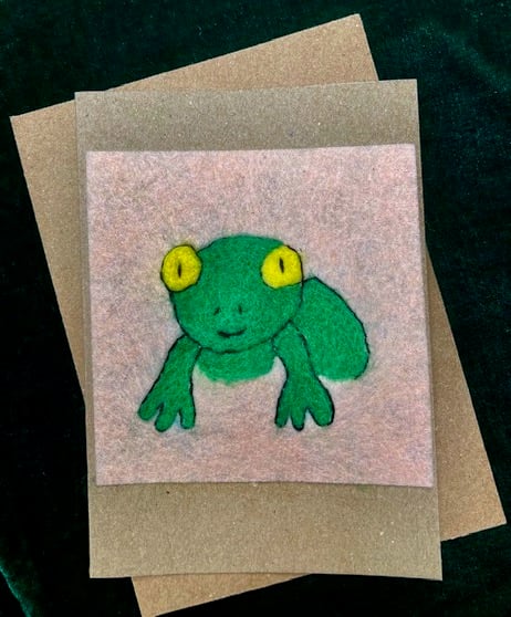 This delightful frog with its bright yellow eyes has been made by needle felting onto a piece of pale pink felt. The picture has then been mounted onto a brown greetings card (4" x 6"). The card comes with a matching brown envelope & has been left blank inside for your own greetings. Colours may vary slightly due to photography.