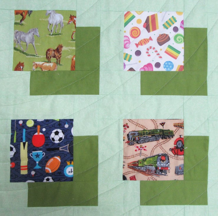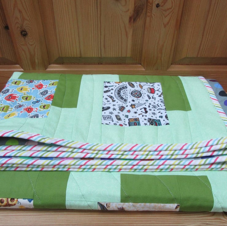 All the outside fabrics are 100% cotton. Inside the quilt is a soft layer of Bosal 80/20 quilters wadding. I have quilted parallel lines of stitching across the quilt. These anchor the three layers (patchwork, wadding and backing) together and give the quilt a soft, cosy feel.