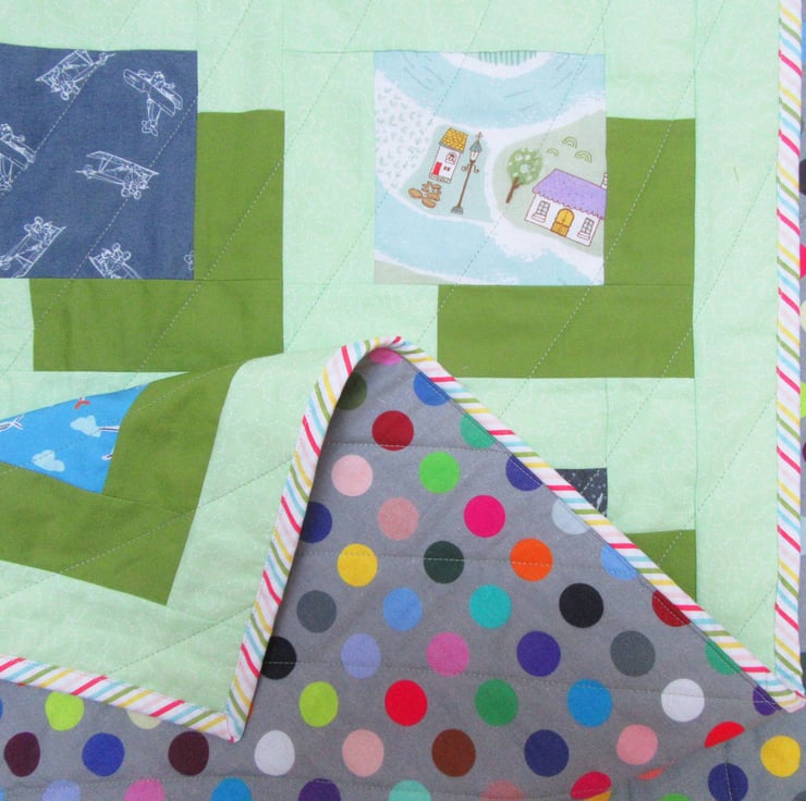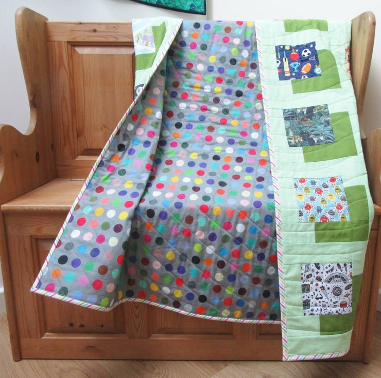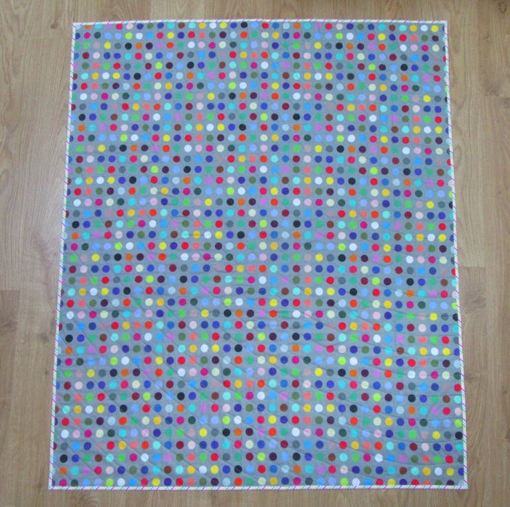 On the reverse side of the quilt is a cotton backing printed with a pattern of multi-coloured spots. The candy stripe, double-layered, binding is also cotton.