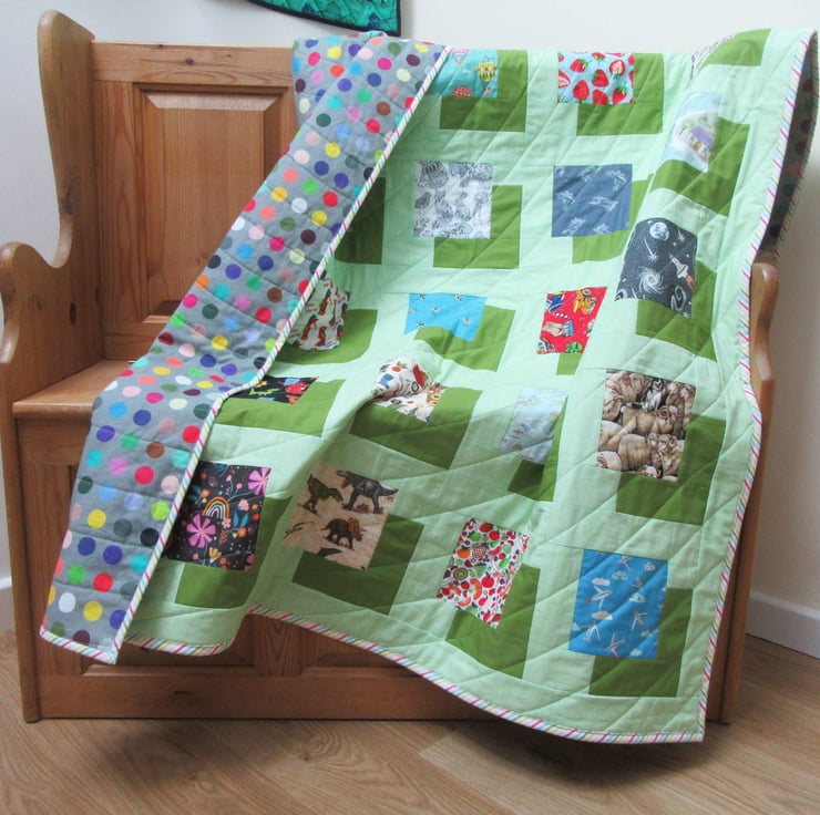 A snuggly patchwork quilt with a built in game of I-Spy With My Little Eye. The bright and cheerful patchwork squares have pictures of animals, vehicles and everyday items. Great for developing observational and language skills through a fun game of I-Spy.