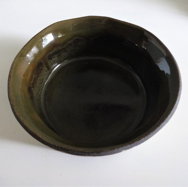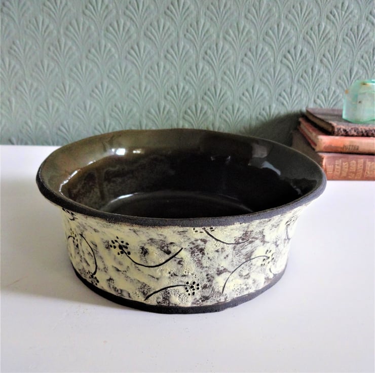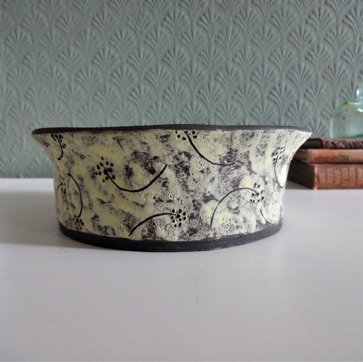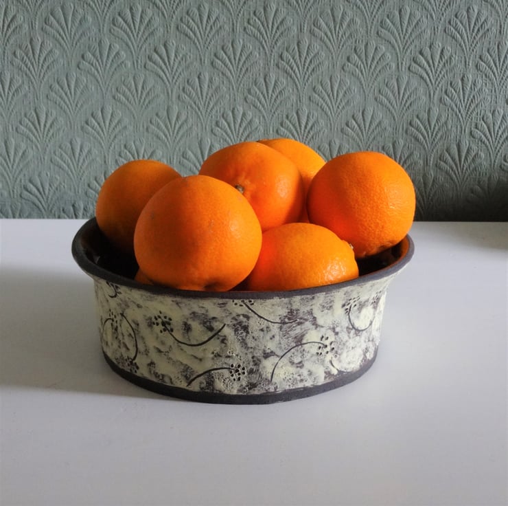 A distinctive handmade bowl (named Lettie) for your living room, hall or bedroom. This lovely bowl is perfect for displaying small fruits, pot pourri, shells, pebbles and seashore finds, lavender, fir cones, or simply a place to pop your keys when you come in! Alternatively, it makes a good flat based bowl in which to stand a houseplant. I shaped the bowl from black stoneware clay, using the coiling technique, one of the earliest forms of pottery making. It has a flat base, straight sides and a gently flaring irregular wave-like rim. Inside I used two glazes – a tenmoku on the base mingling with a dark green on the rim and sides, which fired to a lovely finish of natural shades. On the outside I used a pale lemon band, and incised a decorative seedhead motif to expose the black clay beneath, leaving the matt surface of the natural clay, a technique known as sgraffito. The size is 16cms diameter and approx. 6 cms high – the fruits shown in one of the images are tangerines to give you an idea of scale. This is a decorative display bowl and is not intended for cooking/oven use.