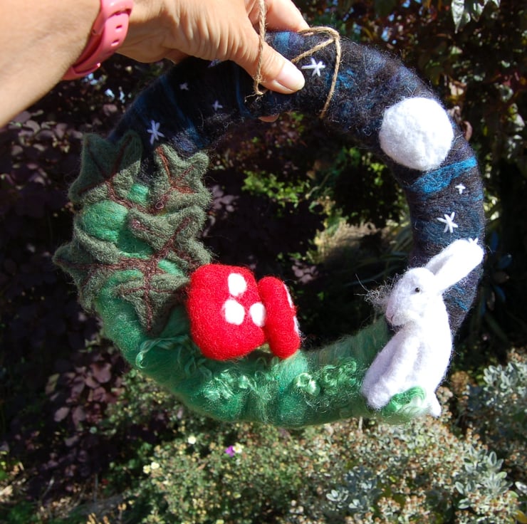 The frame is a wire hoop, covered with wool fibres. The sky is made from dark blue and black coloured wool fibres . I've added a wool moon by needle felting onto the wool base.
