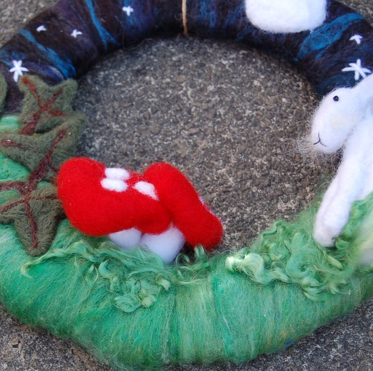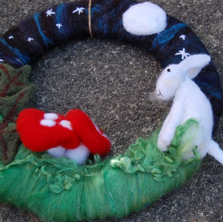 A wool scene of a white hare under the moon and stars. Ivy and two mushrooms add interest.