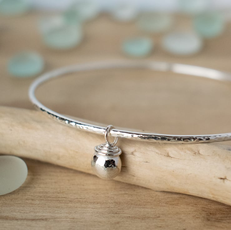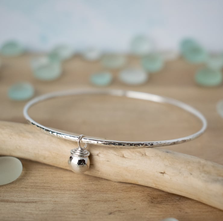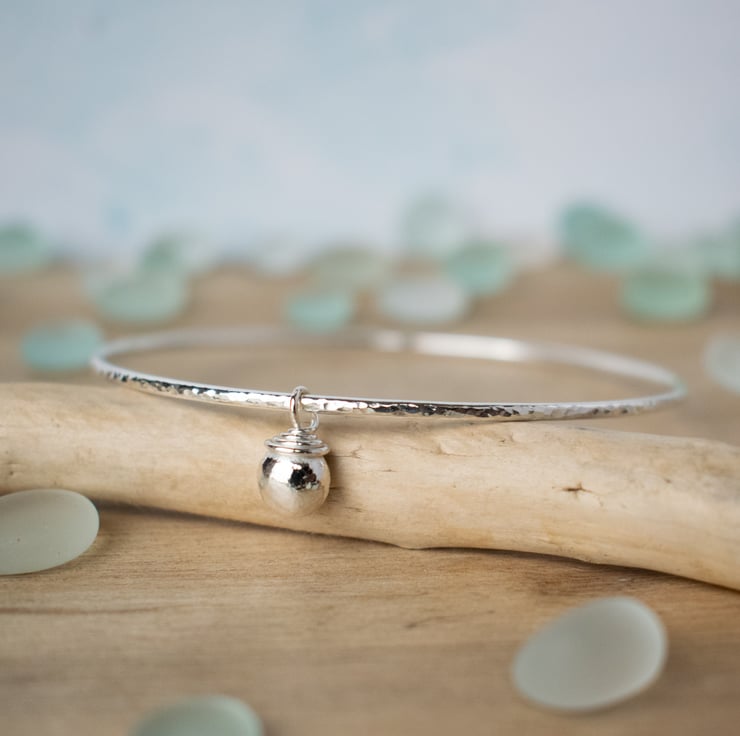 Slim silver bangle with pebble charm. It's minimalist style makes it perfect for everyday wear, or as a gift for a loved one. The bangle is handmade from 1.8mm sterling silver wire, and finished with a hammered texture which makes it dazzle in the light.