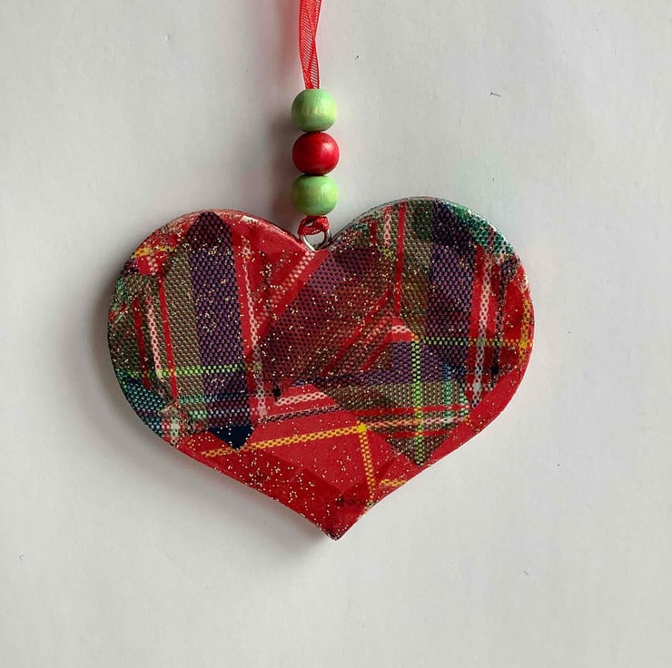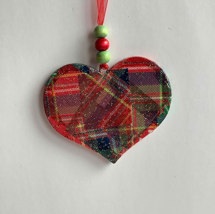 Both sides of this wooden heart have been decopatched in red and green tartan papers and varnished.