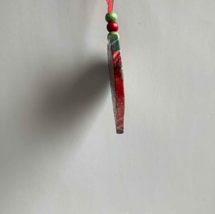 This hearts hangs by a fine red organza ribbon attaching 3 small wooden beads (red and green) which can be removed