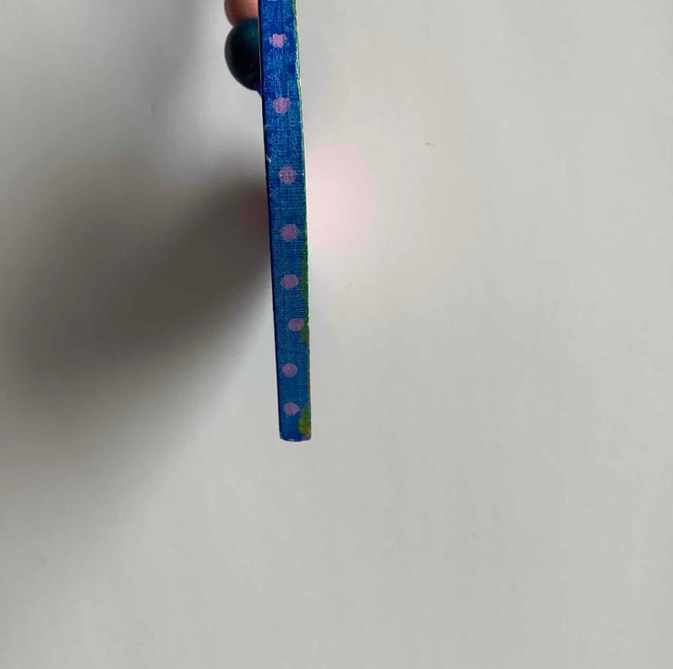 This hearts hangs by a fine blue organza ribbon attaching 2 wooden beads (pink and teal/blue) which can be removed