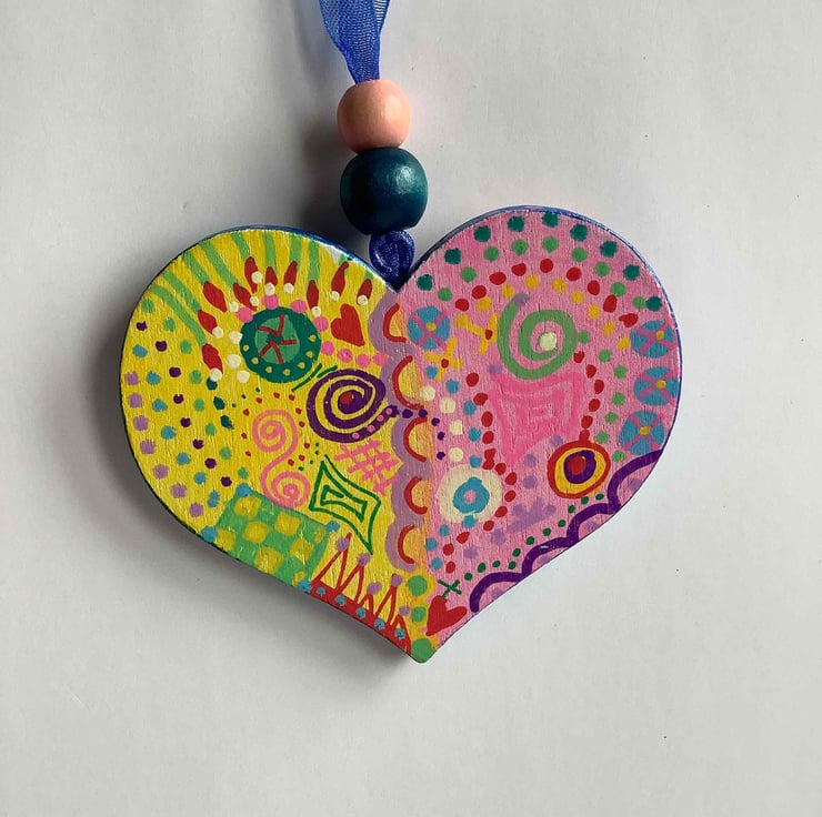 Both sides of this wooden heart have been hand painted in a variety of colours and varnished.