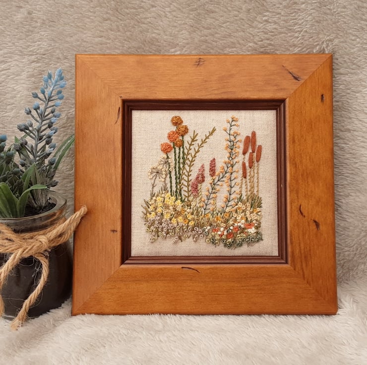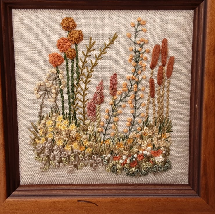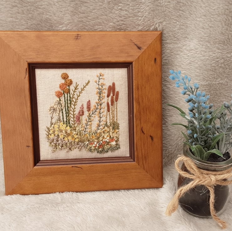 A hand stitched country border, Autumn floral picture, hand embroidery