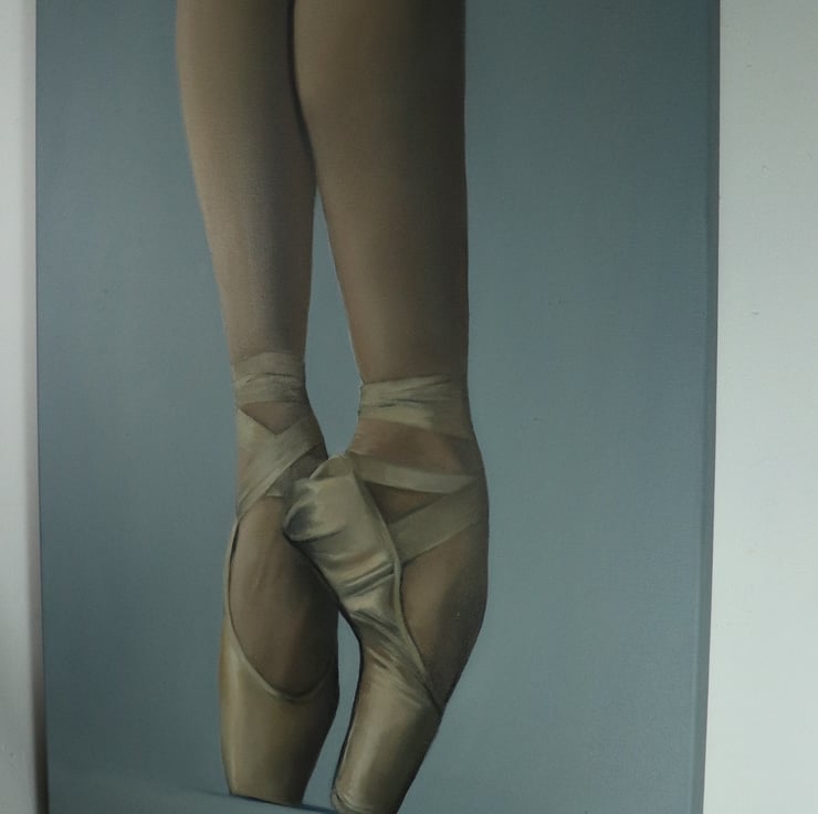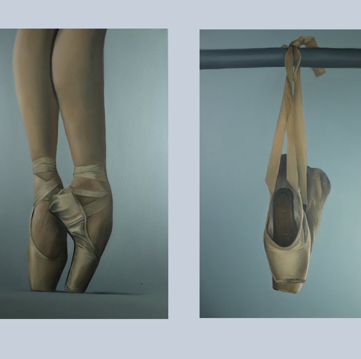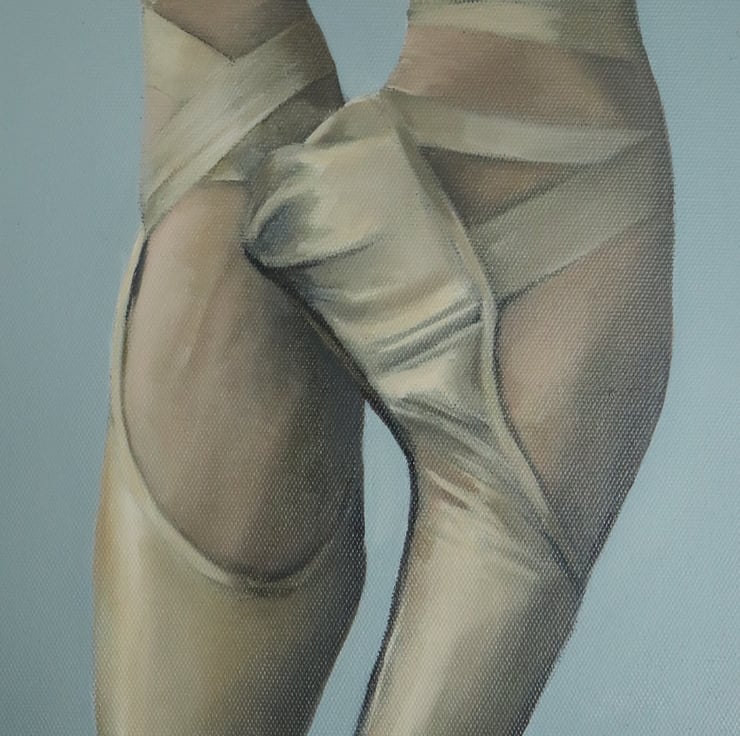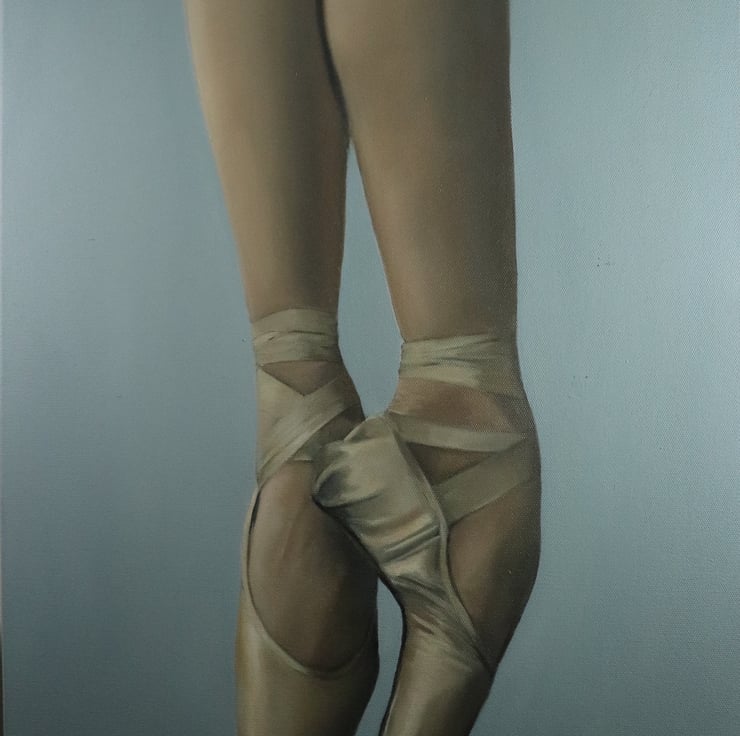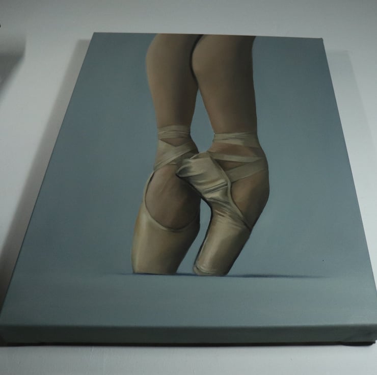 I've painted feet on point for a few years now. I've loved painting the strength of the legs against the the perfect balance in the feet. This painting is the largest I've done on the subject and I loved been able to add details and textures I'd have struggled with on a smaller canvas. I wanted to paint just the shoes, still and heavy without the dancer to make them light.