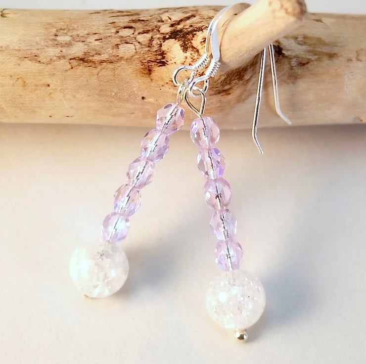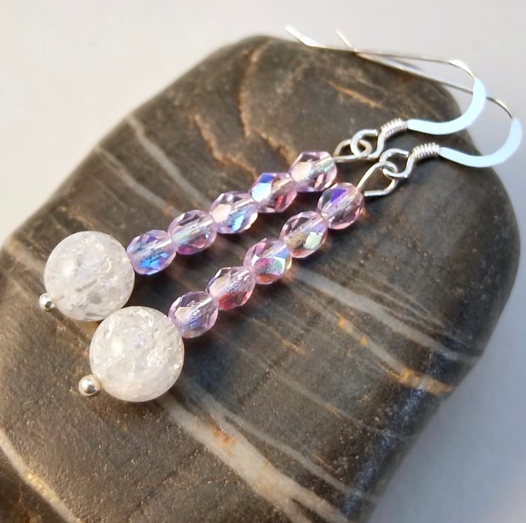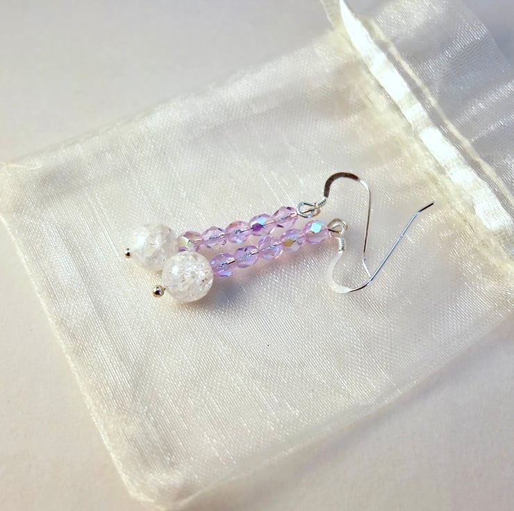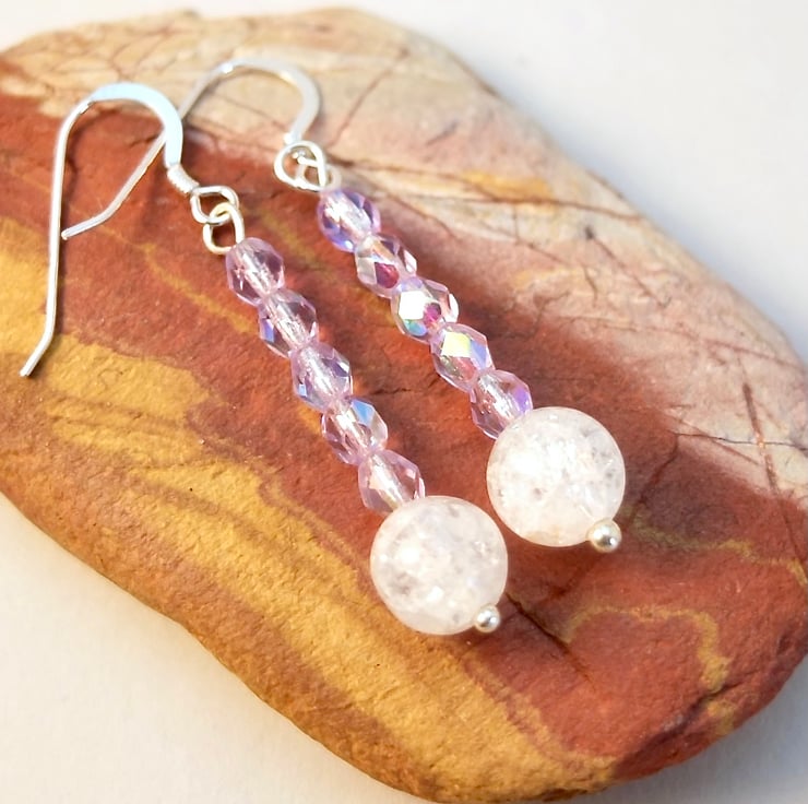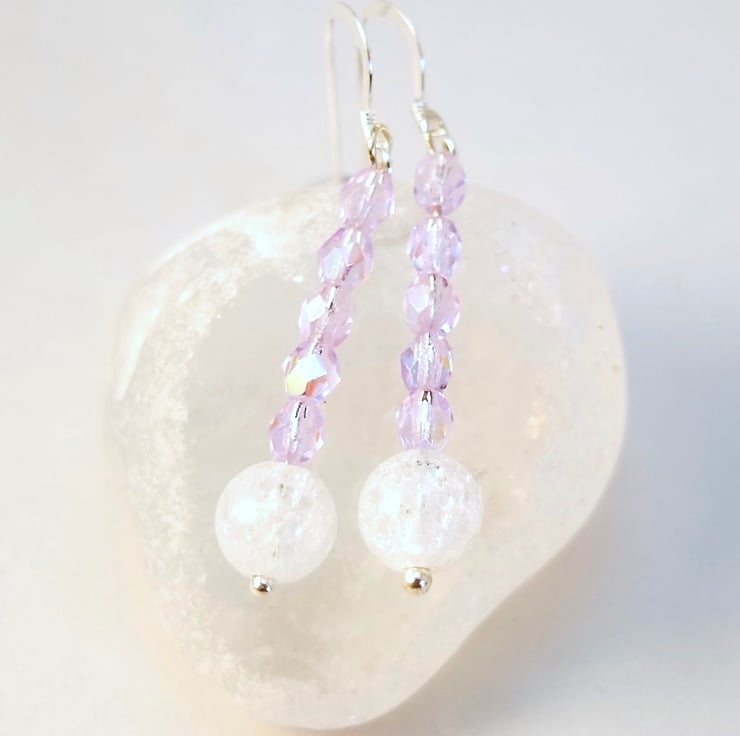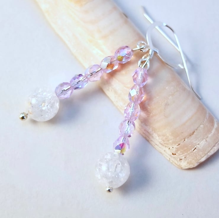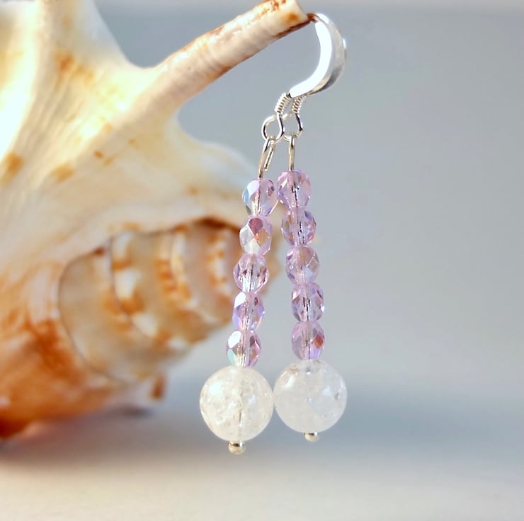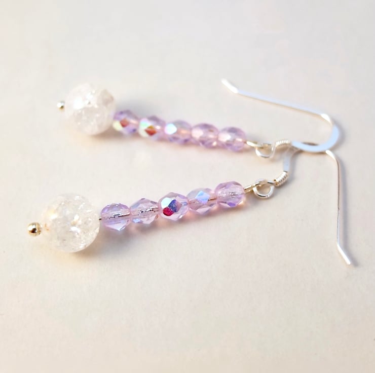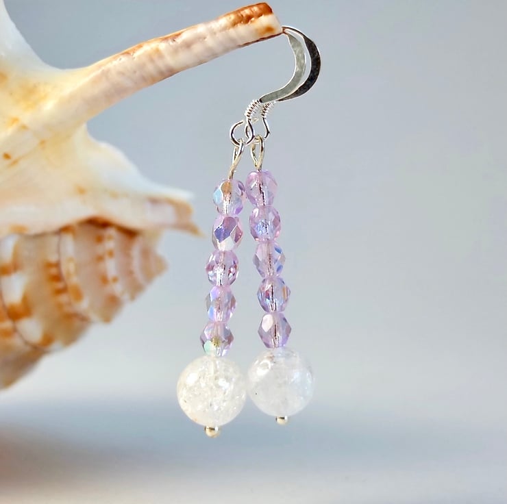 Each earring features an 8mm Crackle Quartz bead topped with five 4mm, sparkly, firepolished, faceted Czech glass 'alexandrite' beads.