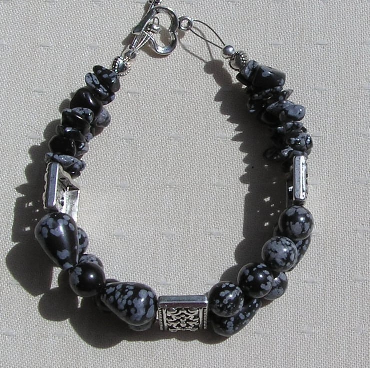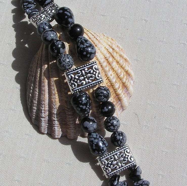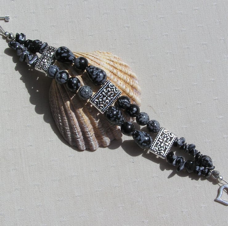 This Stunning Bracelet is made wholly from Snowflake Obsidian – Tear-Drop shaped Beads, Round Beads and Gem Chips … each section separated by an ornately decorated Tibetan Silver Bar Spacer with a tiny Silver Heart at each end - a Beautiful Gothic combination that will look stunning either worn casually or with something more Elegant for a Special Evening out