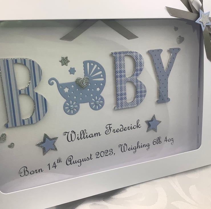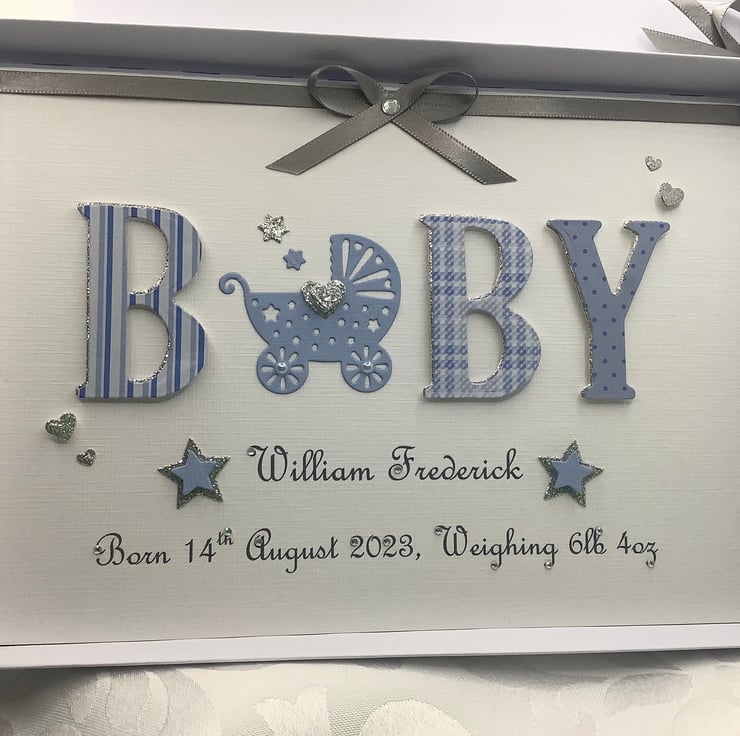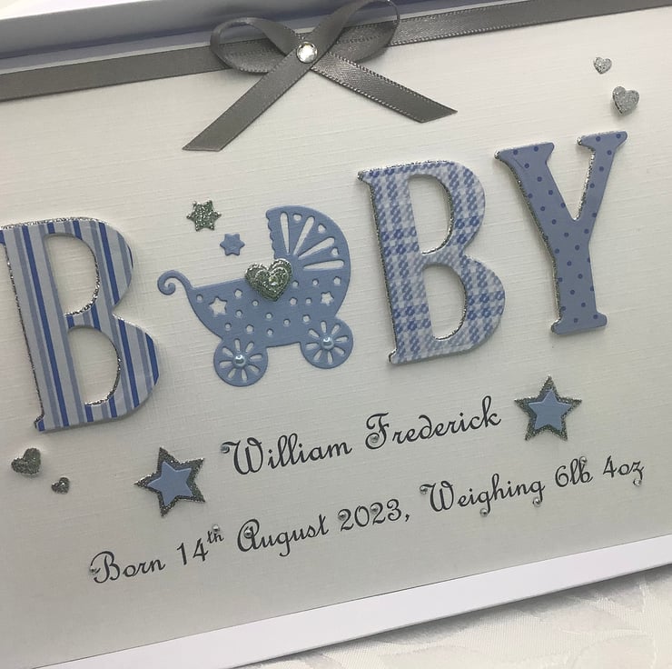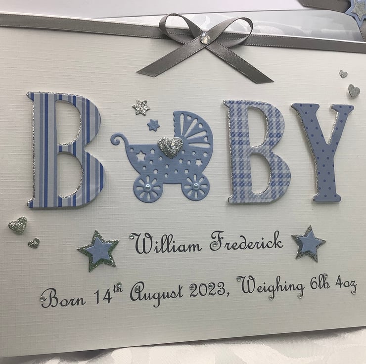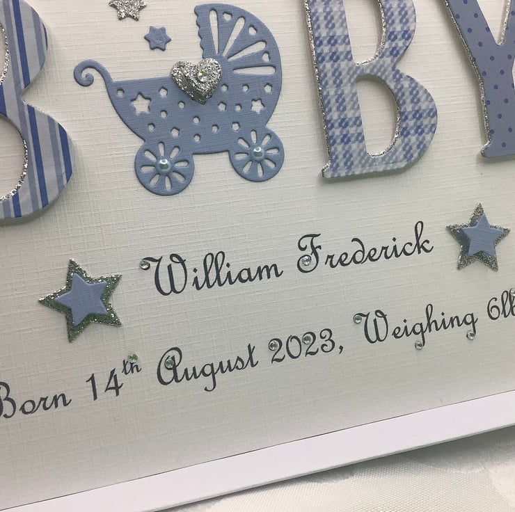 This handmade personalised new baby boy card is A5 in size ( 210mm x 150mm) and is on 300gsm heavyweight linen cardstock. The card can be personalised with the name, date of birth and birth weight.