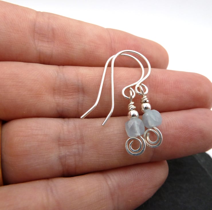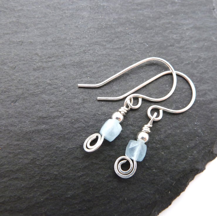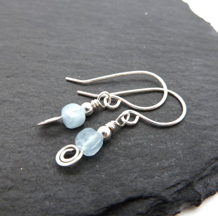 A pair of earrings made with handmade sterling silver ear wires, sterling silver beads and Grade AA shaded Aquamarine gemstone beads.