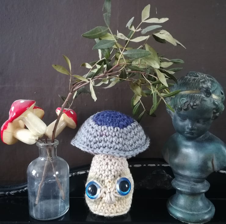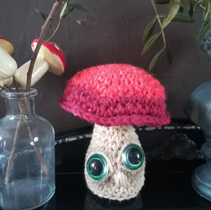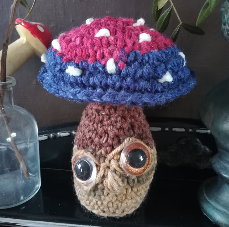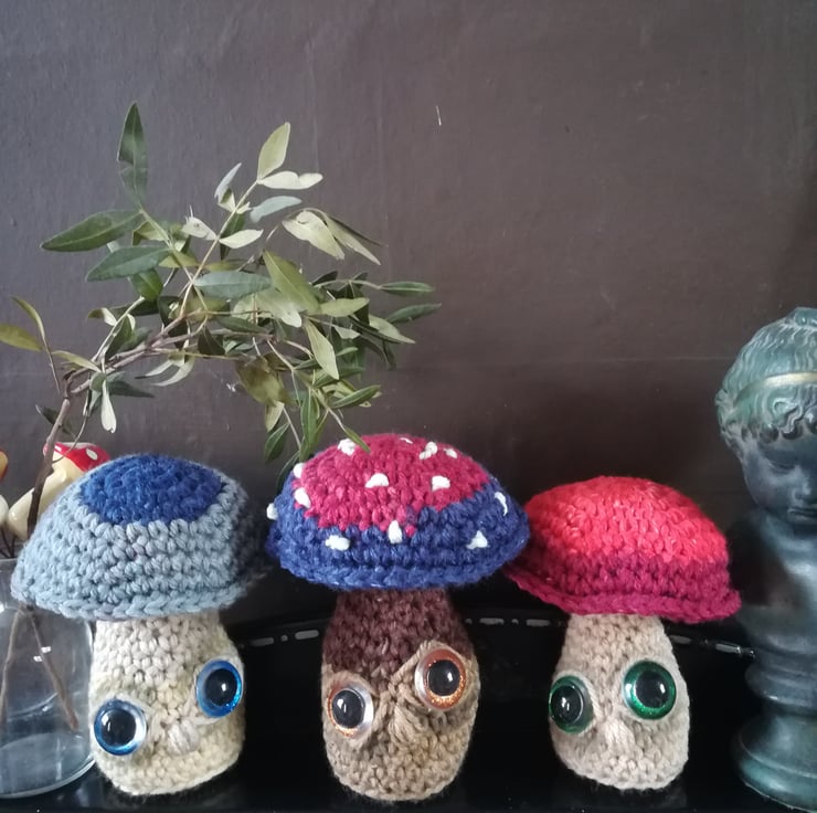 This is a set of three magic mushrooms. They're made using different colours of yarn. Each one is slightly different and they have glitter eyes.