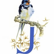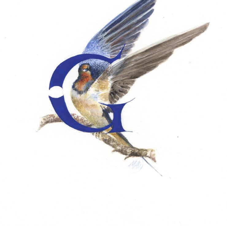 A small beautifully illustrated letter 'G' 87 mm w x 98 mm h, incorporating the image of a bird based on a Swallow, executed in watercolour and gouache on Bockingford hot pressed watercolour paper. This image is one of many that I will produce using calligraphic and constructed letters with images incorporating various subjects and media. I prefer to keep the images as spontaneous as possible, simply enjoying colours, shapes and texture rather than producing photo realist images. Watching the birds in the garden in the Spring triggered the idea of starting with birds, particularly when they are caught in 'movement', dramatic and beautiful.