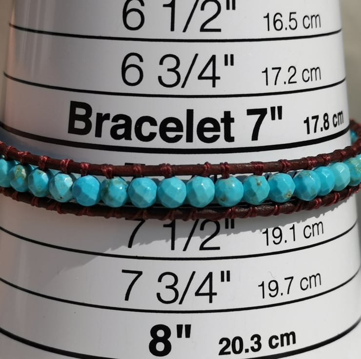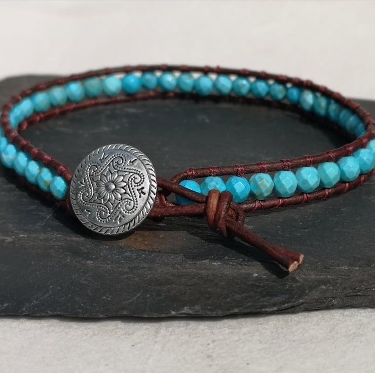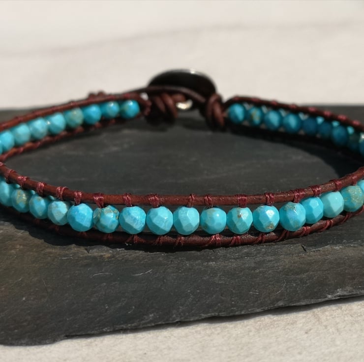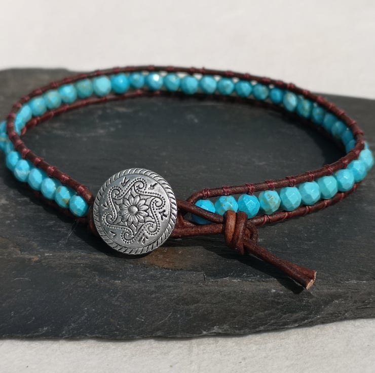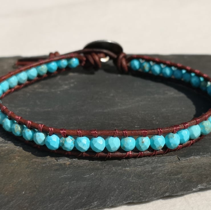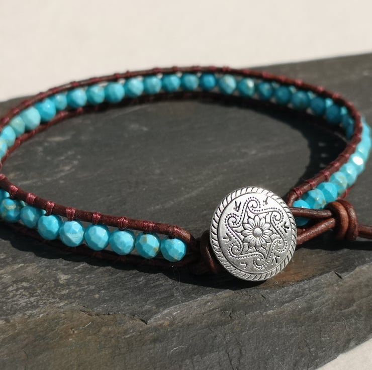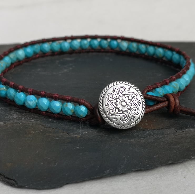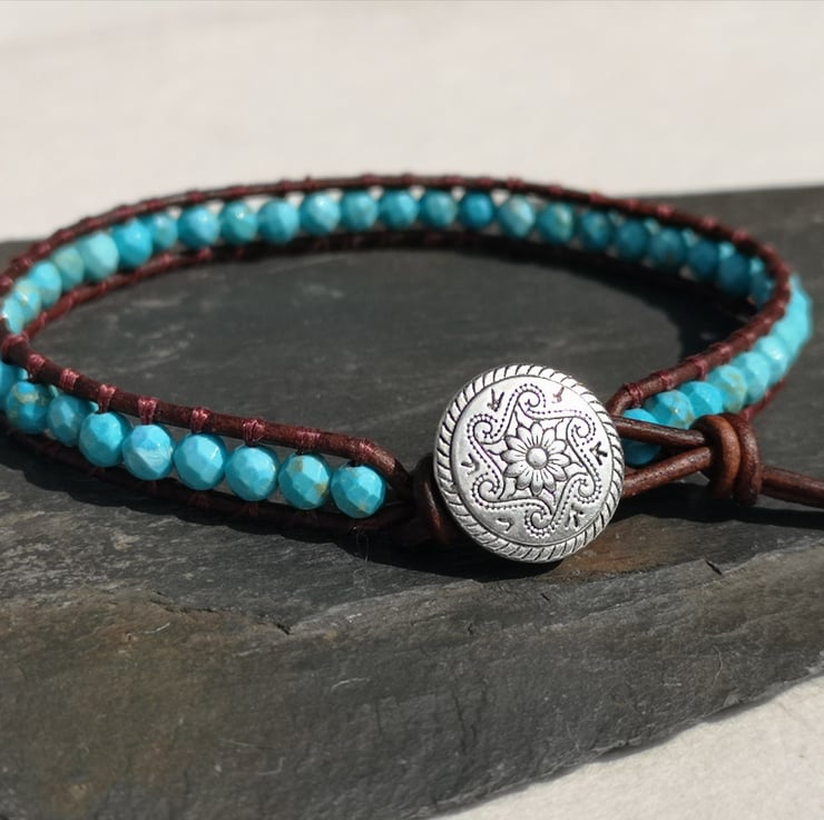 This bracelet has been made with small faceted turquoise beads and dark brown leather cord. A silver coloured button has been used as a fastener.