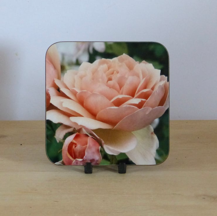 This listing is for one 9cm square by 2m thick coaster of one of my photos of an Apricot Rose taken at RHS Rosemoor in Devont. It has rounded corners, a glossy finish and a plain brown back which should not scratch your surfaces. It will be packed and sent by Royal Mail to arrive safely.