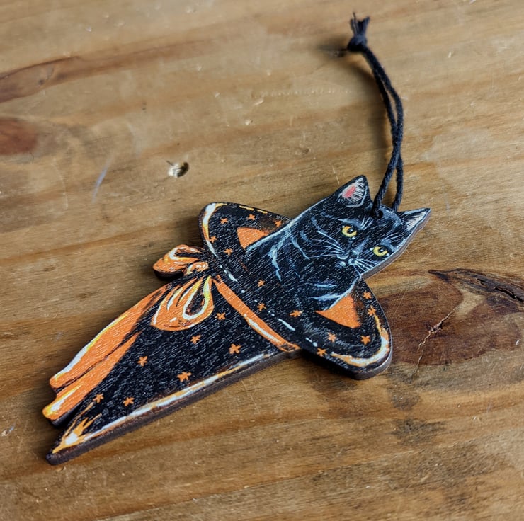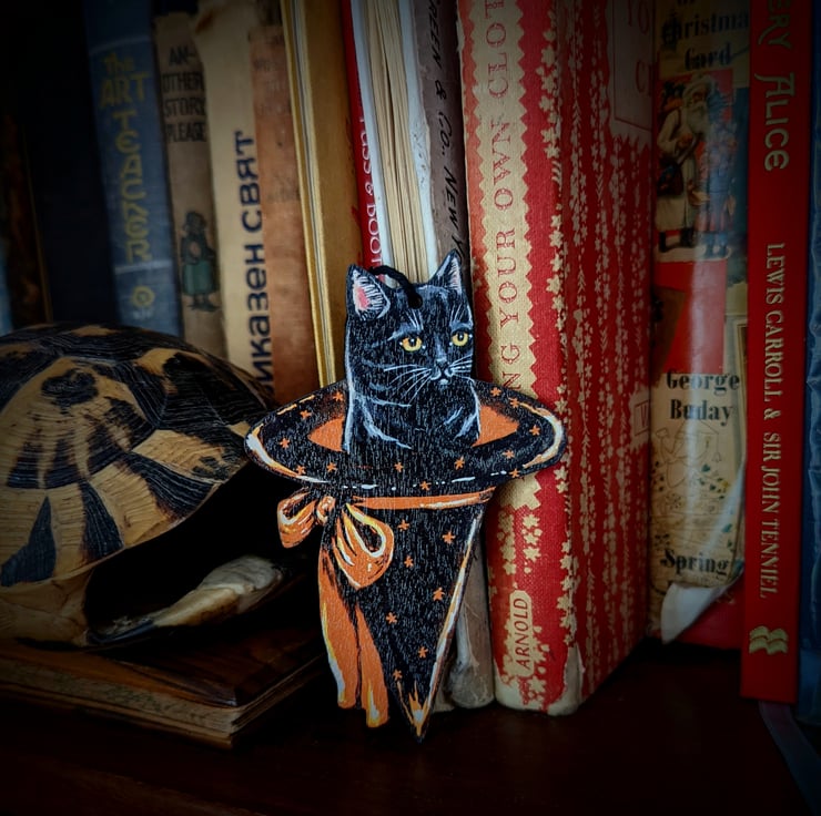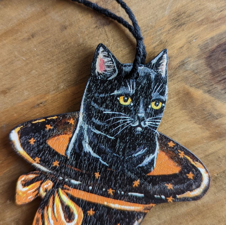 A vintage style wooden Halloween decoration featuring a black cat in a witches hat. He's puurrrfect for hanging on a Halloween themed tree, or great for all year round display too!