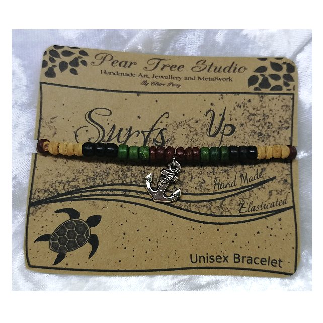 Elasticated Surf bracelet with wooden beads, silver plated Anchor charm.