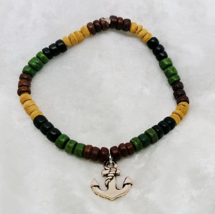 Wooden Surfer's bead bracelet with silver Anchor charm.