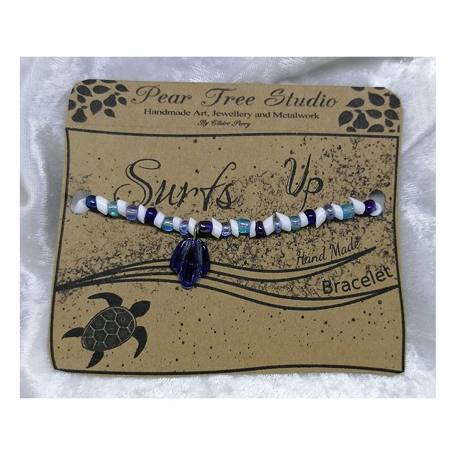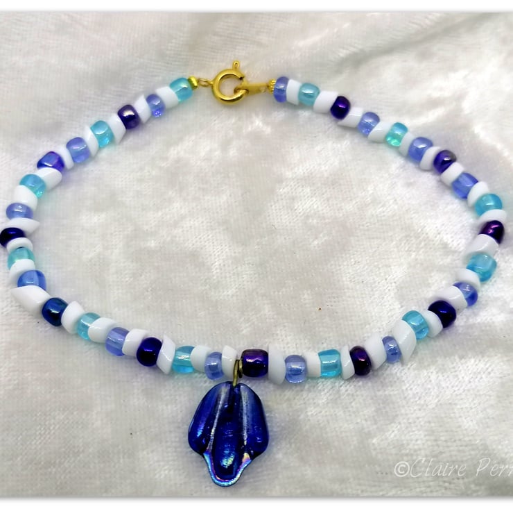 Seed bead bracelet blue and white mixed beads with a glass charm and a gold plated clasp.