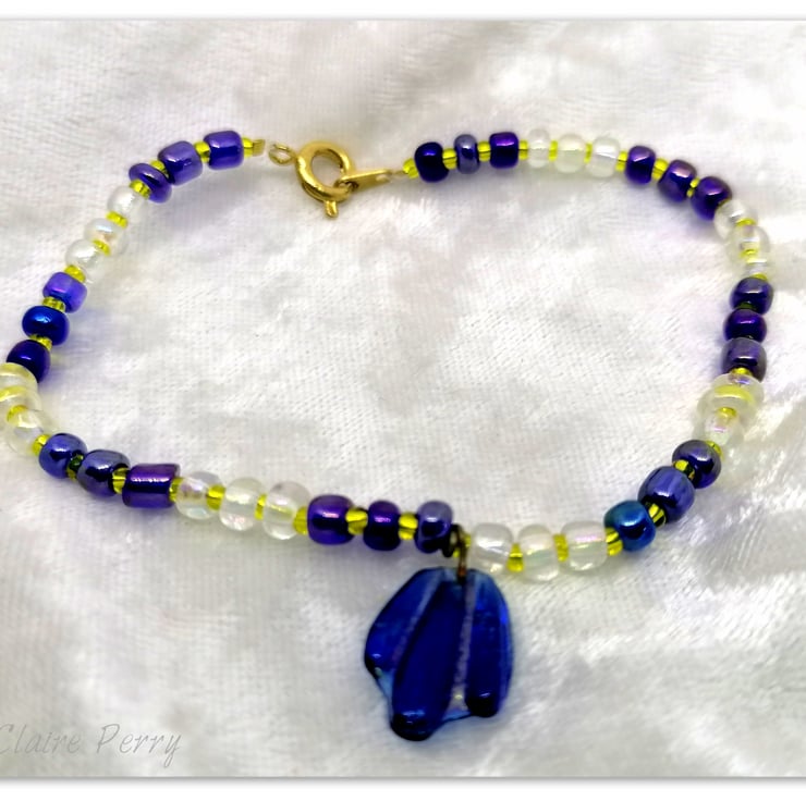 Seed bead bracelet with blue and gold beads, blue glass charm and gold plated clasp.