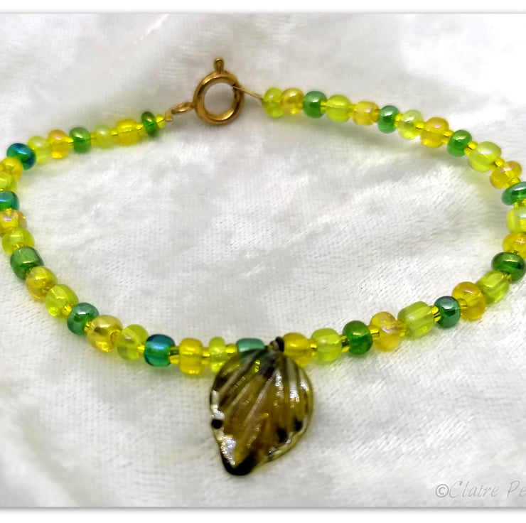 Seed bead bracelet with green coloured glass beads. With a green glass charm and a gold plated clasp.