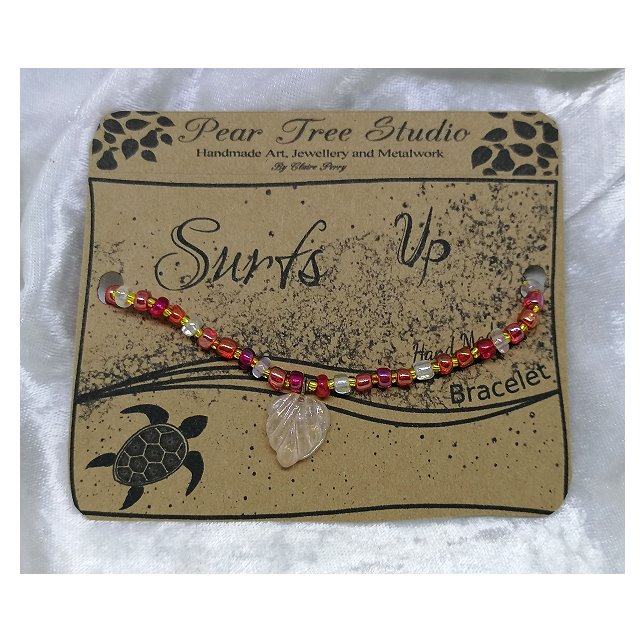 Seed bead bracelet with red coloured glass beads with a pale pink glass charm.